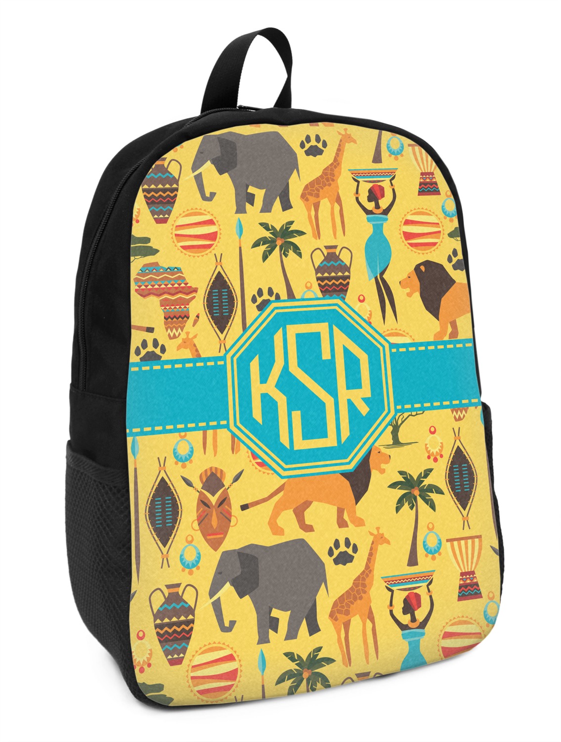 These small backpacks are made of a durable black canvas material with your personalization right on the front. The two shoulder straps are padded and easily adjustable. The bag itself measures at about 11" W x 15" H x 5" D. It's the perfect size for elementary aged kids or adults who want a smaller backpack. On the top of the bag you will find a handle to hang or carry your backpack by as well as a large zipper closure to keep all of your belongings safe inside. On each side of your backpack is a mesh pocket for a small item or water bottle. Inside your backpack you will find a spacious area with a small zipper pocket and a padded laptop slot that will fit up to a 13" laptop (13" being very snug). This is the perfect bag for any student that needs a couple books and their laptop with them at all times. It also works great as a carry on for traveling!