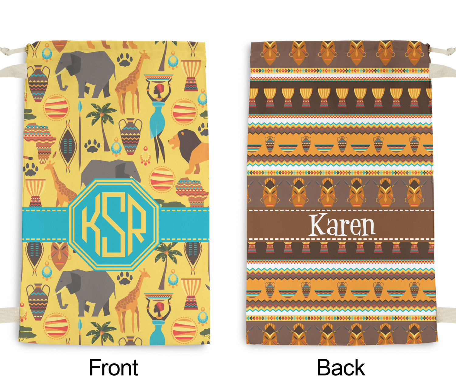Carry your laundry in style with these customized laundry bags. Available in two sizes, featuring a natural colored woven strap and a cinch cord, these bags hold a lot of clothes or anything else you want to fit in them.