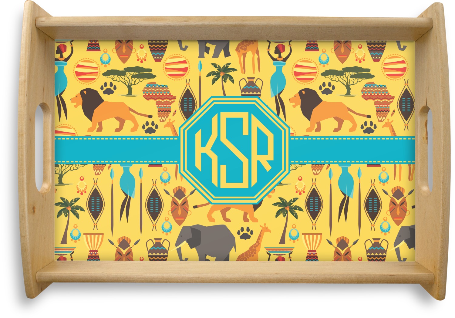 This serving tray with handles features square edges and two rounded sides, creating a very modern look. Each side is fabricated from a beautifully cut, natural wood. The bottom of the interior of the tray displays your customized design in bright, vibrant color. The tray is sold in both a black color and a natural wood look. Each variation of the wood serving tray has two sizes: Small, which is 14" x 10" x 2.25", and Large, which is 19.5" x 13.5" x 2.75".