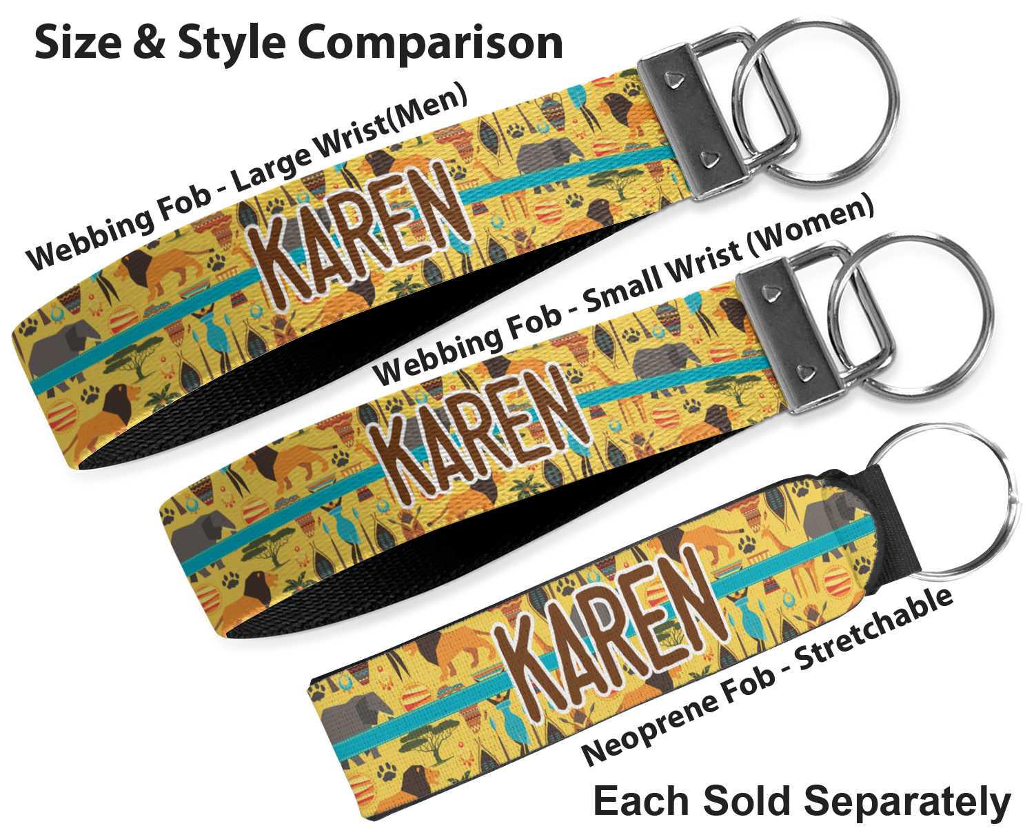 Made from neoprene, these key fob wristlets are comfortable, cushioned, easy to slip on and off; these traits allow it to maintain a slim, yet fashionable appearance, all while optimizing your efficiency. When attaching or removing keys, simply squeeze open the included metal ring. These fobs measure at around 4 inches, and have a bit of a stretch. Thus, they are best suited for small to medium size wrists. If you require a larger size, check out our webbing keychain fob for larger sizing.