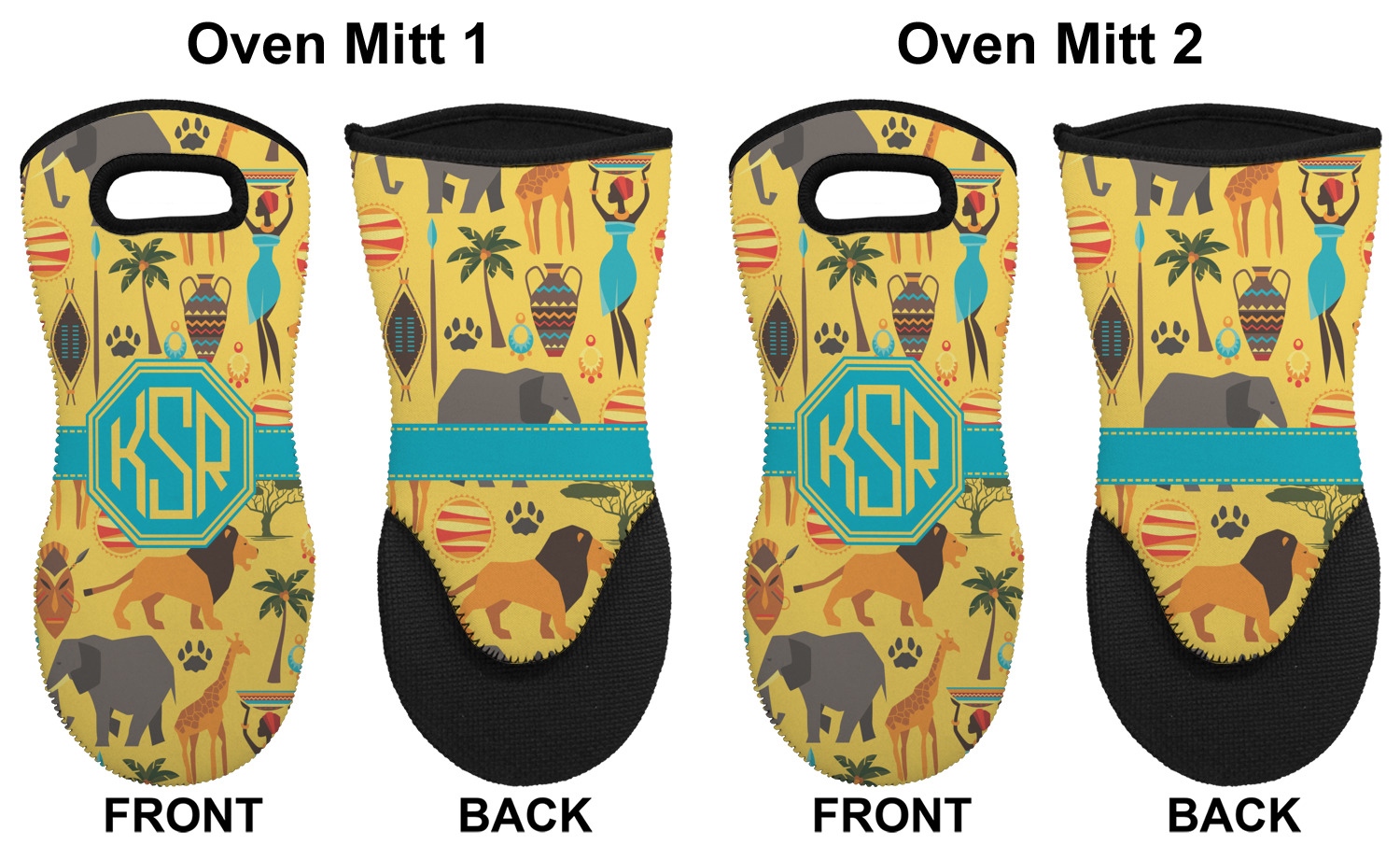 These heat resistant gloves are made entirely of a durable neoprene; the front features a softer texture, while the palm's side has a textured surface, meant to handle heat up to 500 degrees Fahrenheit. Thick, heavy duty stitching connects the two sides. A small, oval cutout appears on the front, and can be used to hang and store the mitt. Your personalization appears on the front, and the upper part of the back of the mitt. The style of these oven mitts are suitable for both the right and left hand, depending on your needs. If you need one for each hand, be sure to order two!