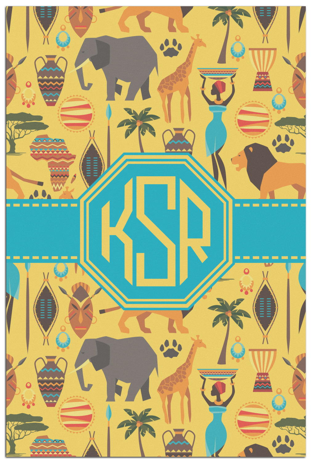 When you think of Africa, multiple things come to mind. Lions. Elephants. Giraffes. Intricate vases. This design encompasses everything you could imagine about the African Safari, all overlaid on a bright yellow background.