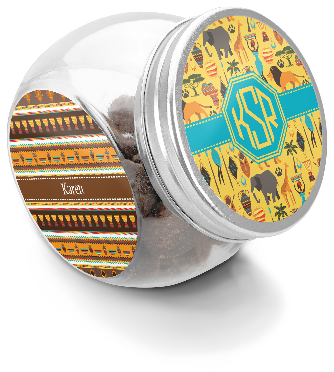 This treat jar is an excellent way to store treats for your favorite canine or feline. Moreover, their delicate, classy appearance makes them a tasteful addition to your countertop's décor. Crafted from clear glass, its unique construction and silver metal, screw-on lid allows for quick and easy access. Three, permanent, vinyl stickers are applied to both sides of the jar and lid, presenting your personalized design. The base of this glass, dog treat jar is 3.4" x 4.75", and the jar stands at 5" tall. Though on the smaller side, this jar is best suited for smaller treats or training treats.