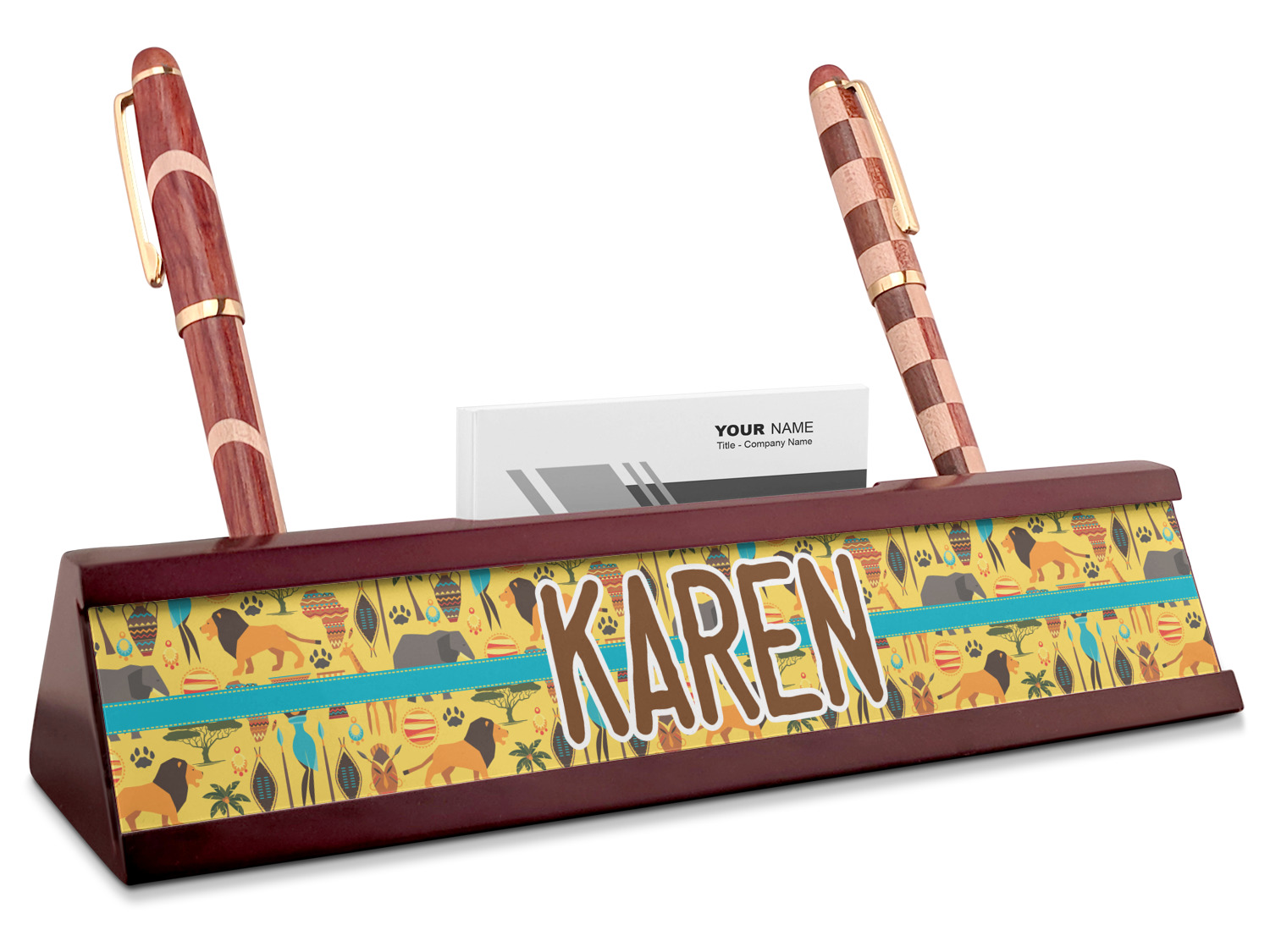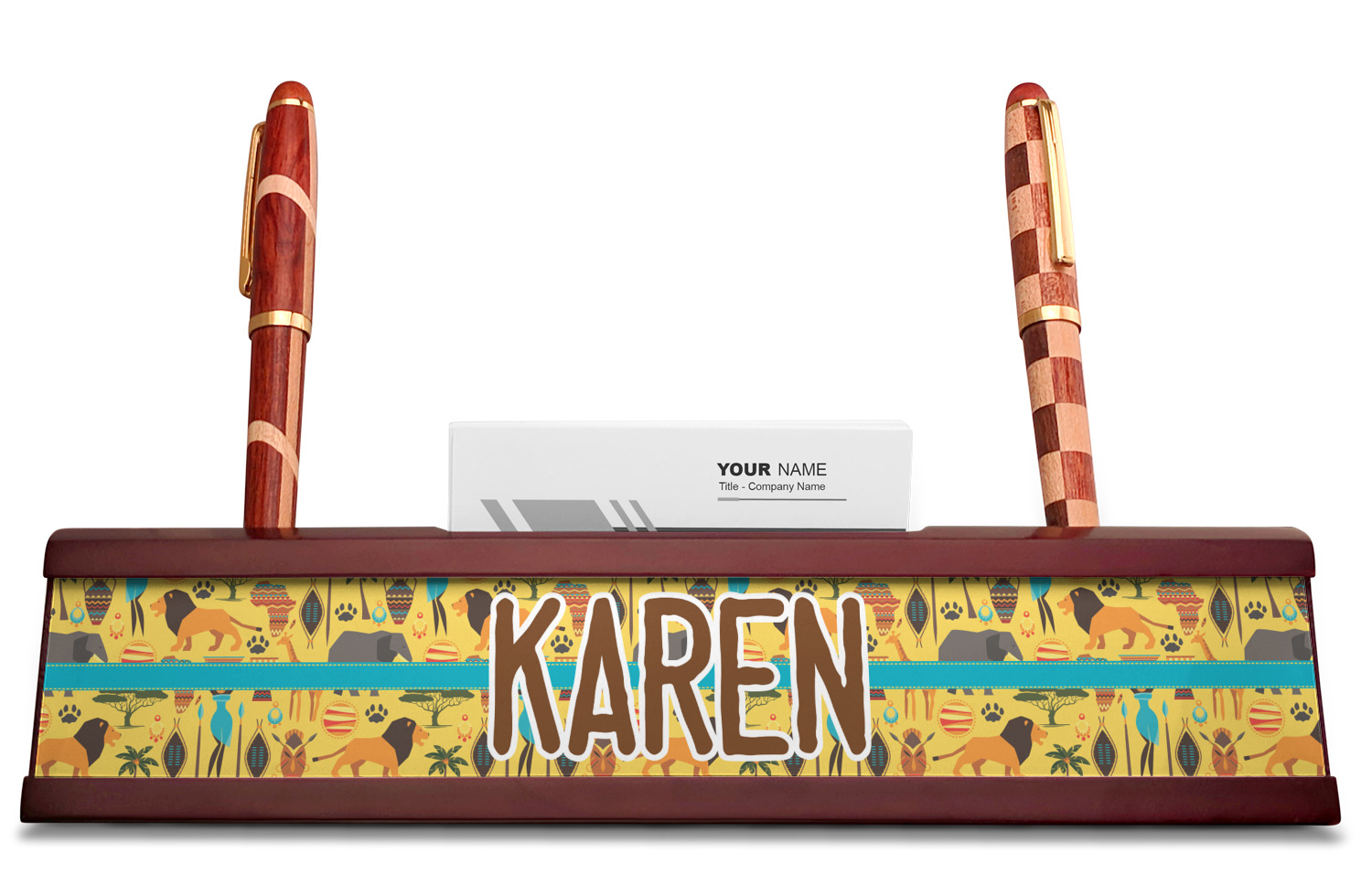 Your desk name plates are crafted from a high-quality, dark-cherry mahogany. At approximately 9.5 by 1.875 by 2.5 inches, this name plaque will fit perfectly, front and center, on your desk. Your customization spans across the entire face of the nameplate. Behind the nameplate lies a skinny slot that can fit approximately 15, traditionally-sized, business cards. You can also store your writing utensils on either side of this custom desk name plate.