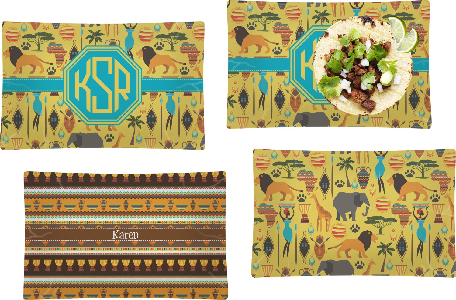 When you think of Africa, multiple things come to mind. Lions. Elephants. Giraffes. Intricate vases. This design encompasses everything you could imagine about the African Safari, all overlaid on a bright yellow background.