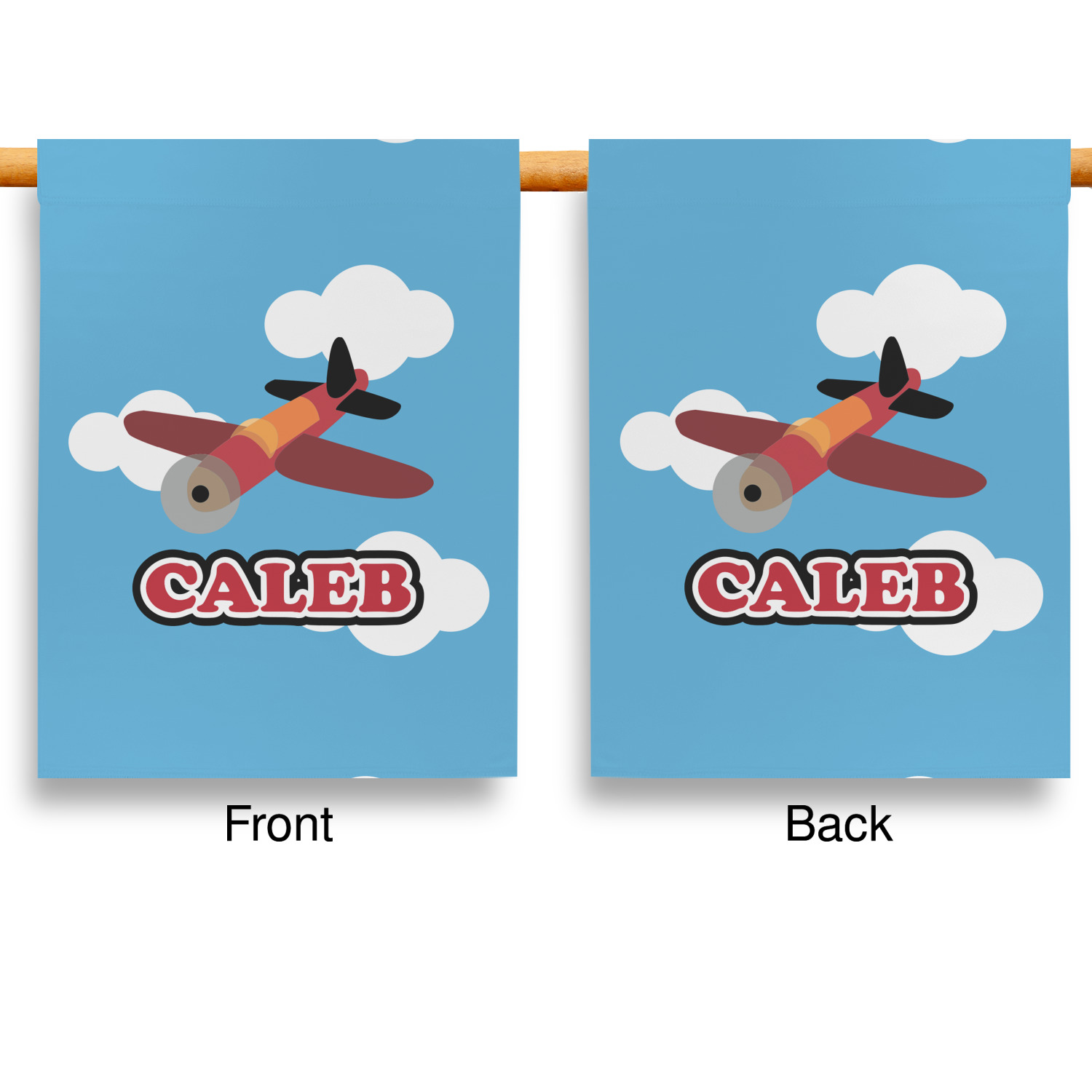 Calling all aviation enthusiast! Soaring through on a backdrop of a beautiful blue cloudy sky is our fun flying plane brightly colored in shades of reds and oranges. Don't forget to add that special touch by customizing the design with the name of your choice.