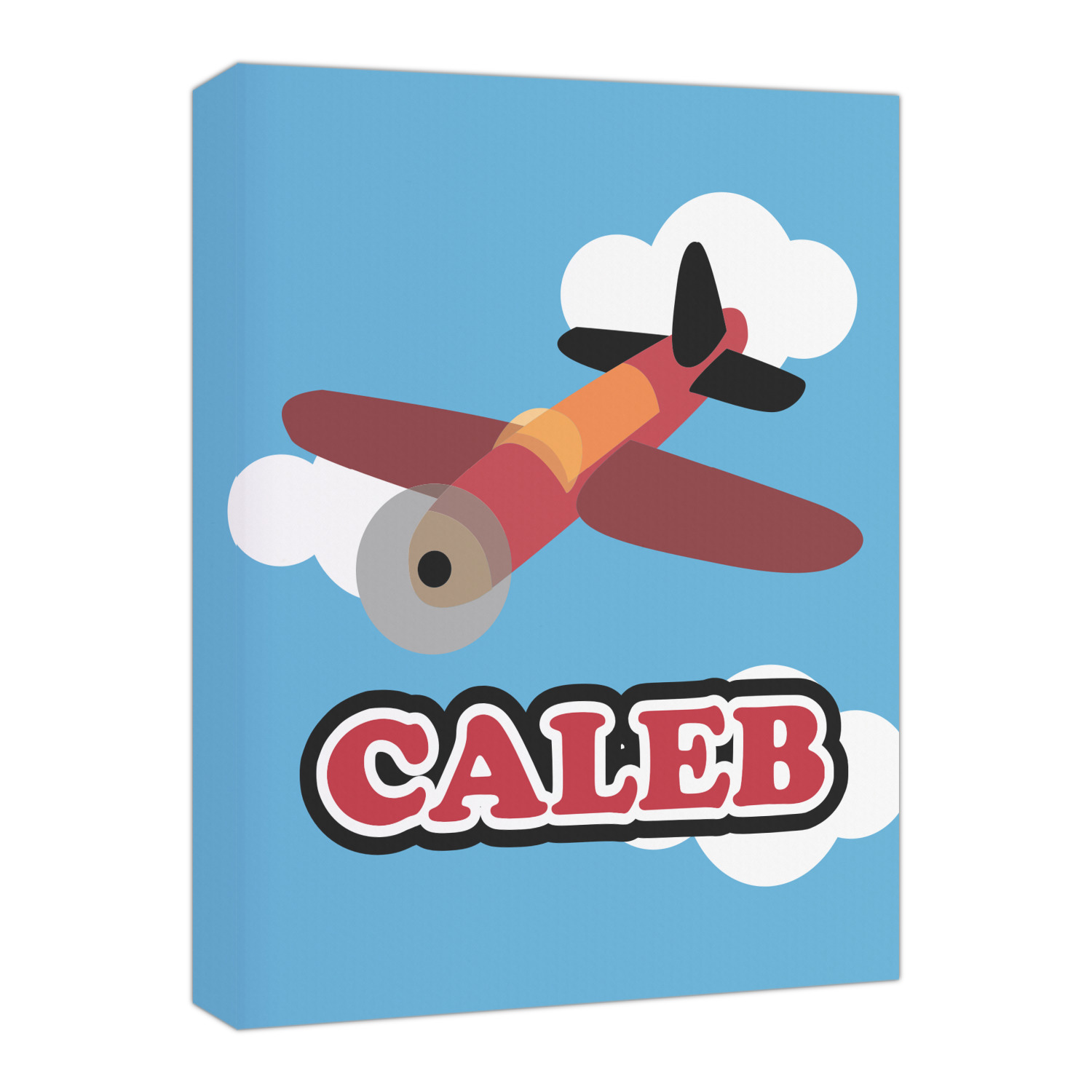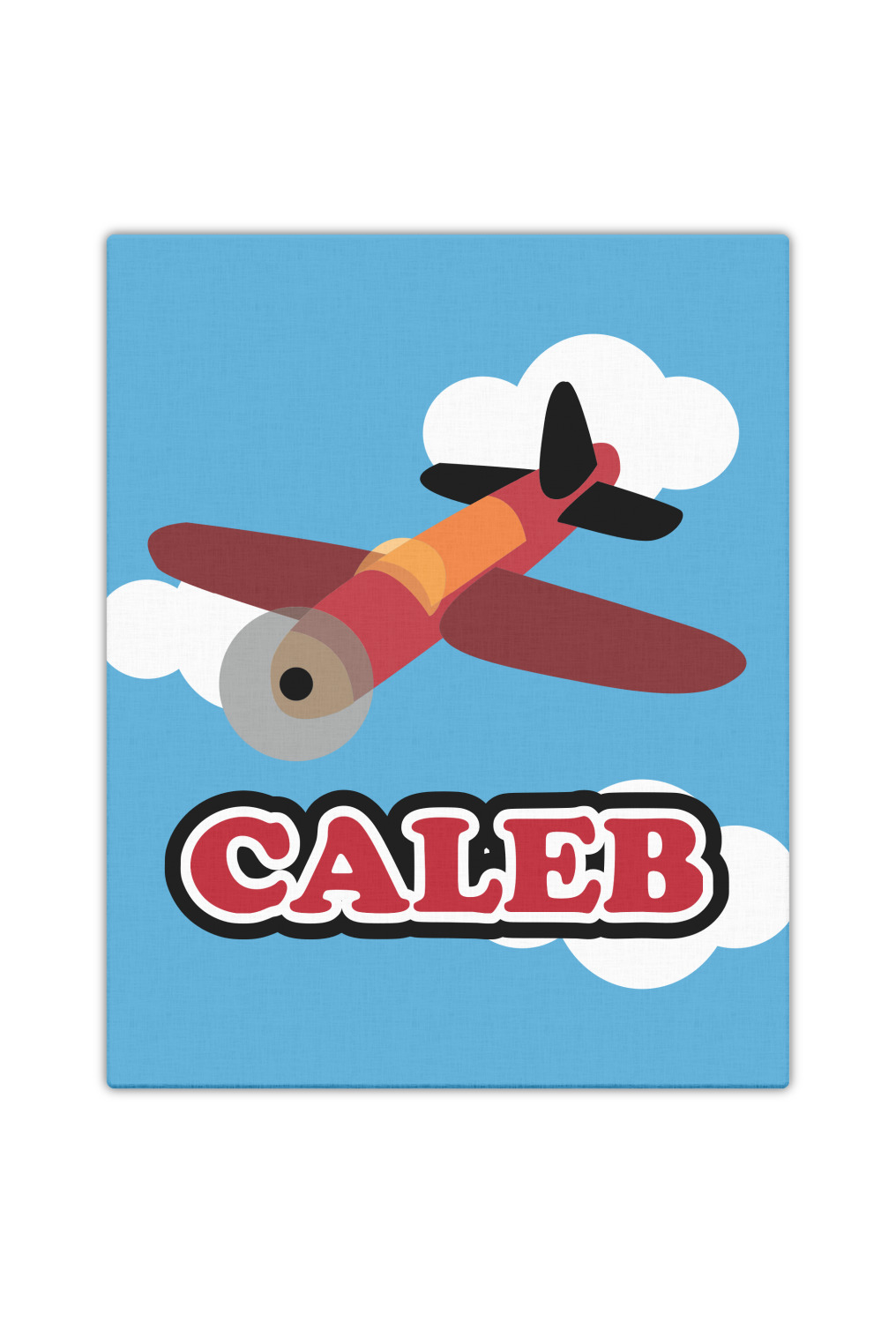 Calling all aviation enthusiast! Soaring through on a backdrop of a beautiful blue cloudy sky is our fun flying plane brightly colored in shades of reds and oranges. Don't forget to add that special touch by customizing the design with the name of your choice.