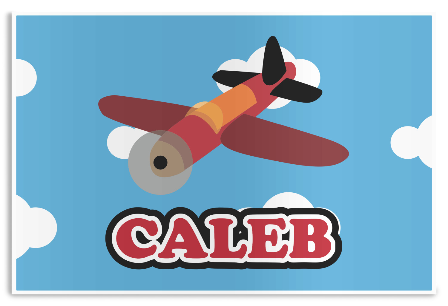Calling all aviation enthusiast! Soaring through on a backdrop of a beautiful blue cloudy sky is our fun flying plane brightly colored in shades of reds and oranges. Don't forget to add that special touch by customizing the design with the name of your choice.