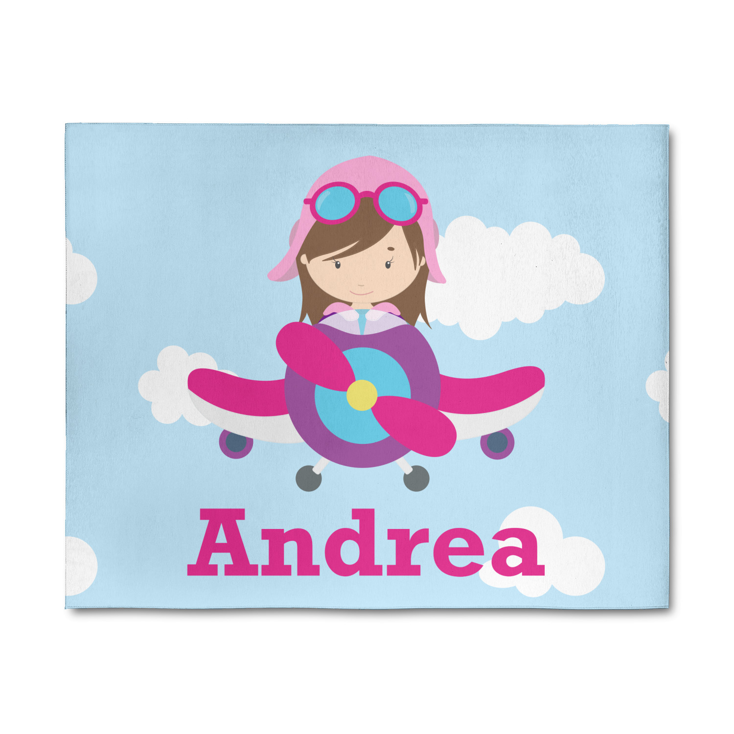 Do you have a little girl that loves planes? Soaring through on a backdrop of a beautiful blue cloudy sky is our fun flying aviator in the cockpit if her own personal plane brightly colored in shades of pink, purple, and blue. Don't forget to add that special touch by customizing the design with your little girl's name.