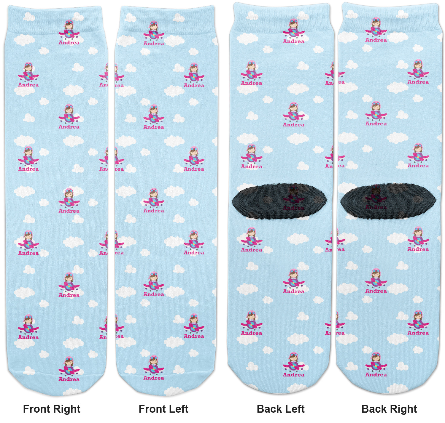 Do you have a little girl that loves planes? Soaring through on a backdrop of a beautiful blue cloudy sky is our fun flying aviator in the cockpit if her own personal plane brightly colored in shades of pink, purple, and blue. Don't forget to add that special touch by customizing the design with your little girl's name.