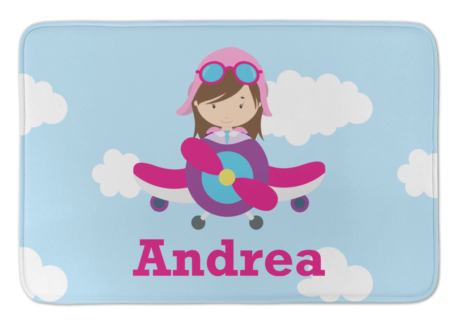 Do you have a little girl that loves planes? Soaring through on a backdrop of a beautiful blue cloudy sky is our fun flying aviator in the cockpit if her own personal plane brightly colored in shades of pink, purple, and blue. Don't forget to add that special touch by customizing the design with your little girl's name.