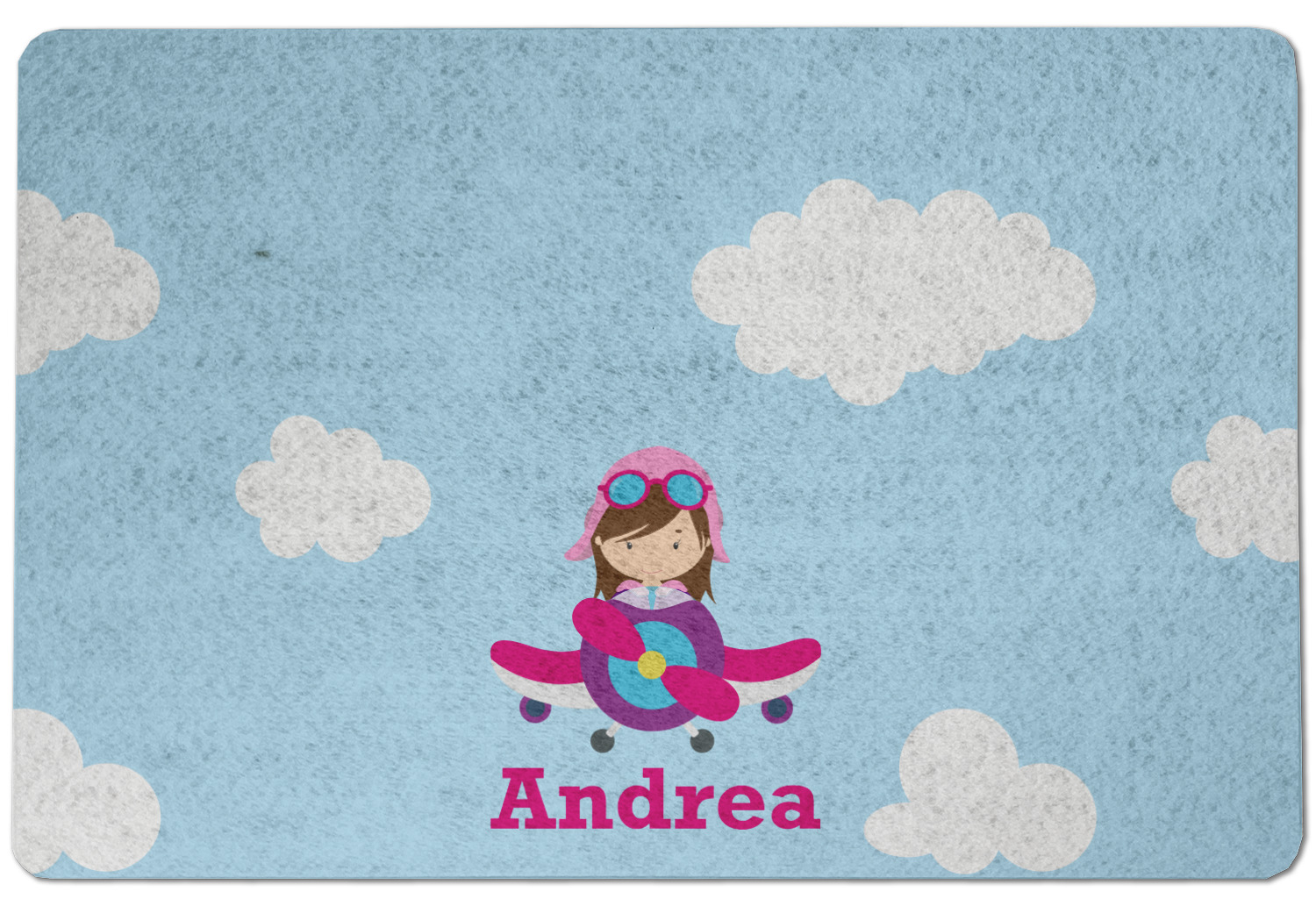 Do you have a little girl that loves planes? Soaring through on a backdrop of a beautiful blue cloudy sky is our fun flying aviator in the cockpit if her own personal plane brightly colored in shades of pink, purple, and blue. Don't forget to add that special touch by customizing the design with your little girl's name.