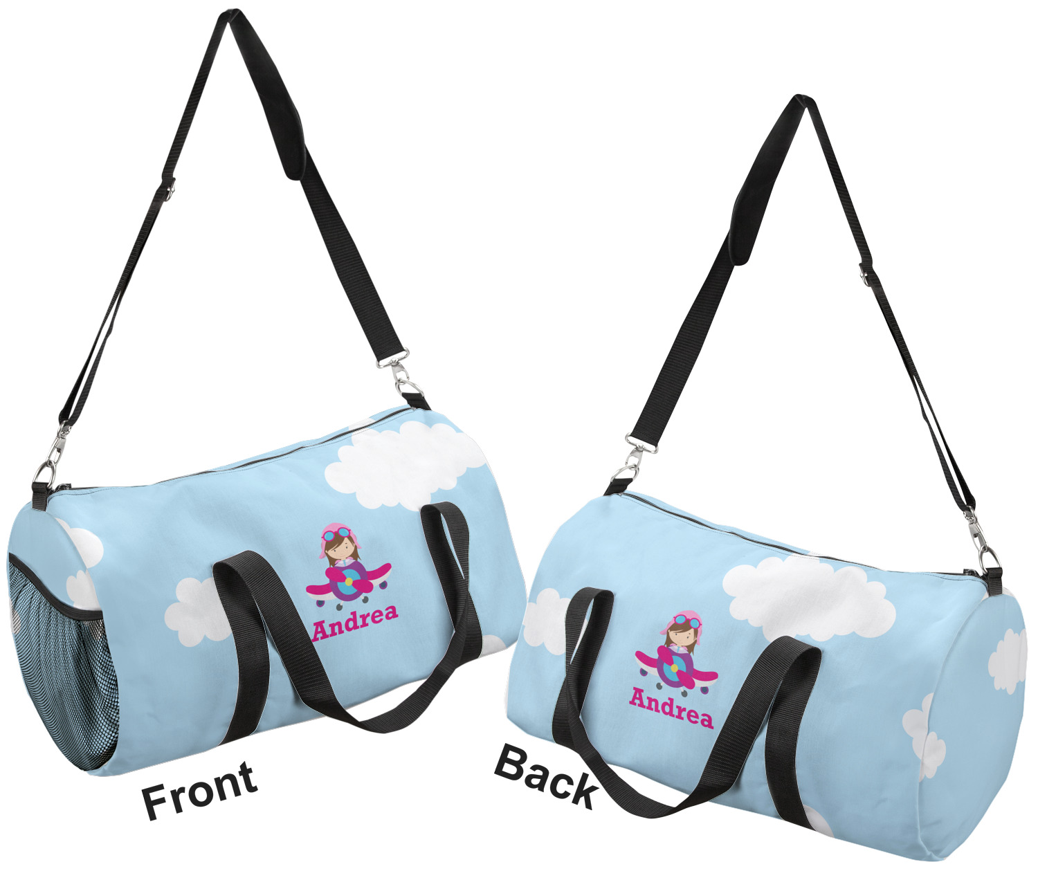 This duffle is a sturdy bag made of a canvas material. It comes in two sizes: Small (19"W x 9.5"H x 9.5"D) and Large (23"W x 12"H x 12"D). The bag is a cylindrical shape with a black adjustable strap and two handles. On one side is an elastic pouch to put a waterbottle or other small item. Your product will be sublimated with your design and is able to be designed on the front, back, and sides. Be sure to remember that the straps may cut into parts of your design if you upload your own artwork.