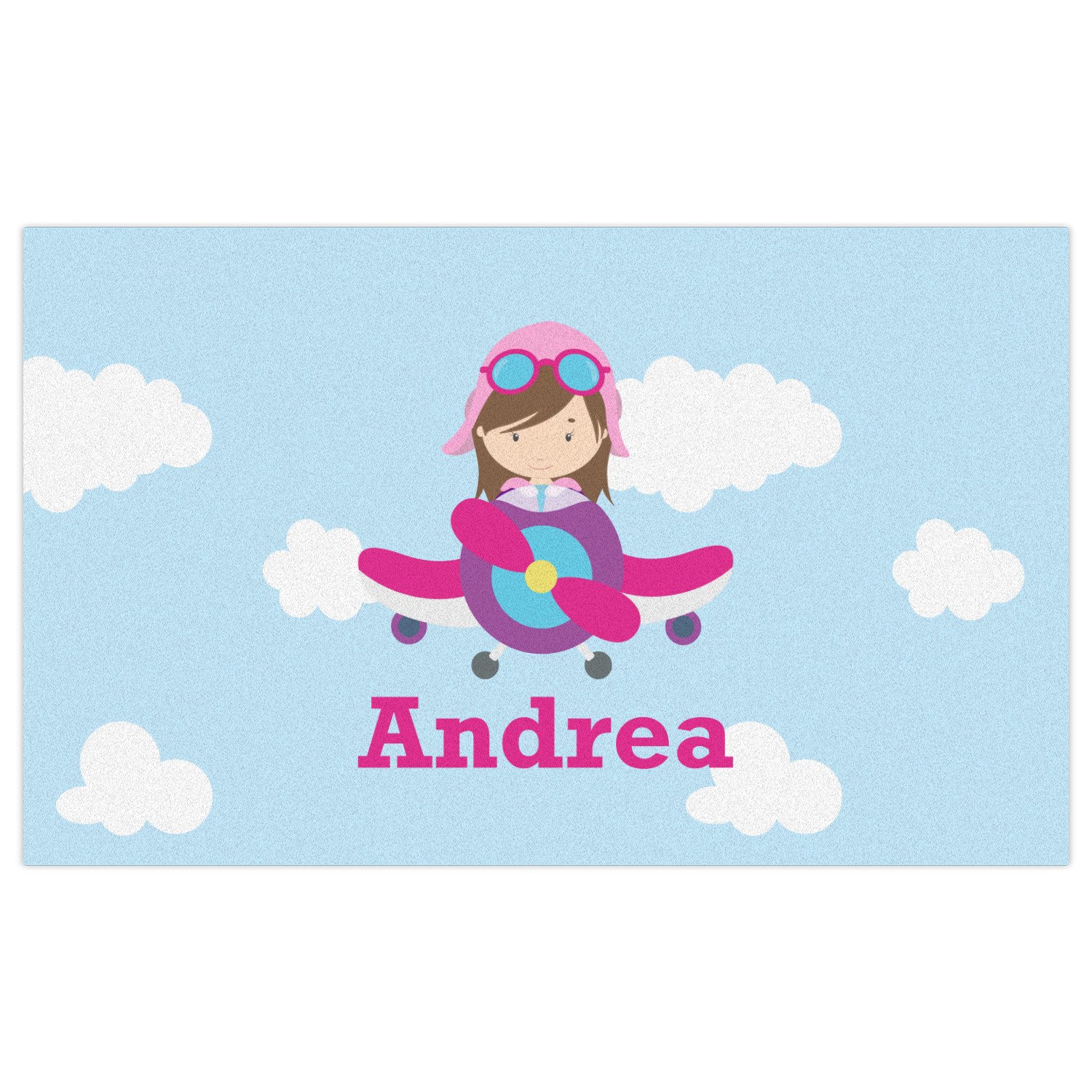 Do you have a little girl that loves planes? Soaring through on a backdrop of a beautiful blue cloudy sky is our fun flying aviator in the cockpit if her own personal plane brightly colored in shades of pink, purple, and blue. Don't forget to add that special touch by customizing the design with your little girl's name.
