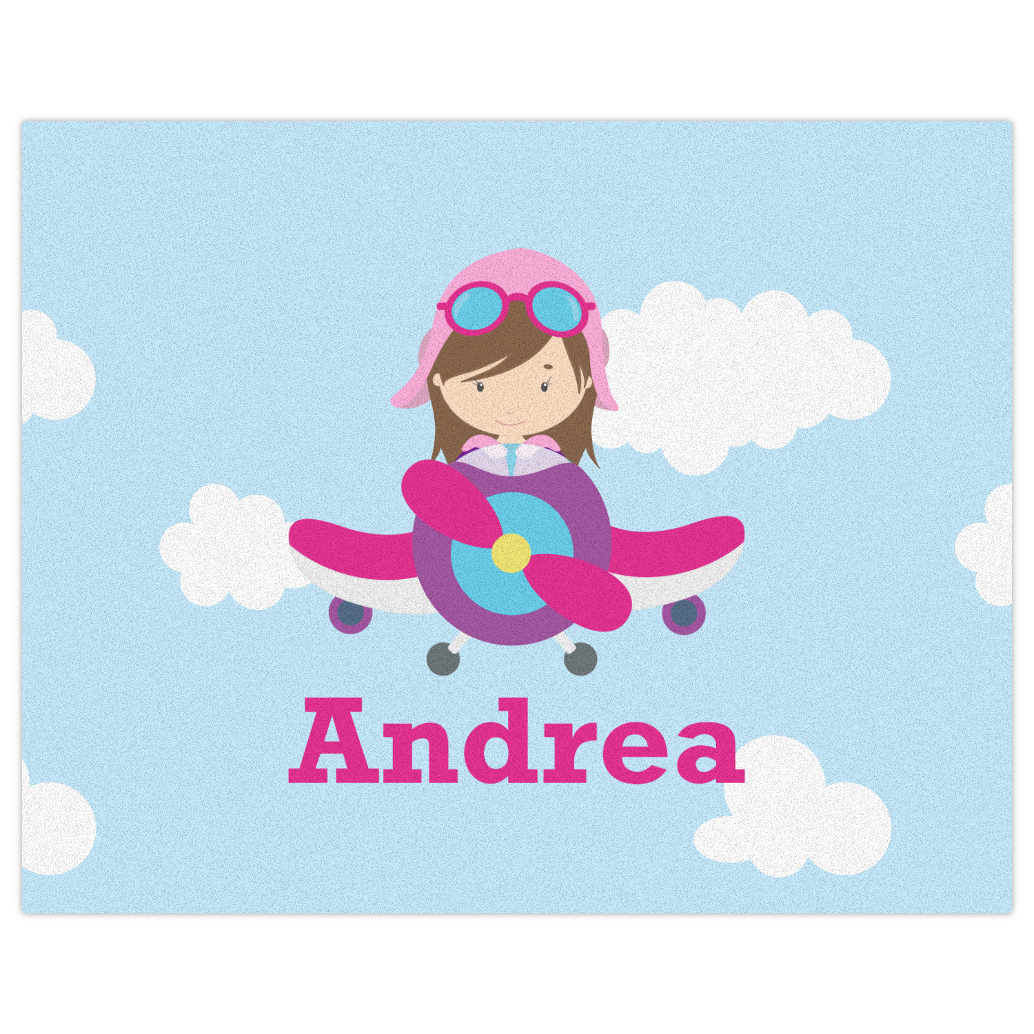 Do you have a little girl that loves planes? Soaring through on a backdrop of a beautiful blue cloudy sky is our fun flying aviator in the cockpit if her own personal plane brightly colored in shades of pink, purple, and blue. Don't forget to add that special touch by customizing the design with your little girl's name.