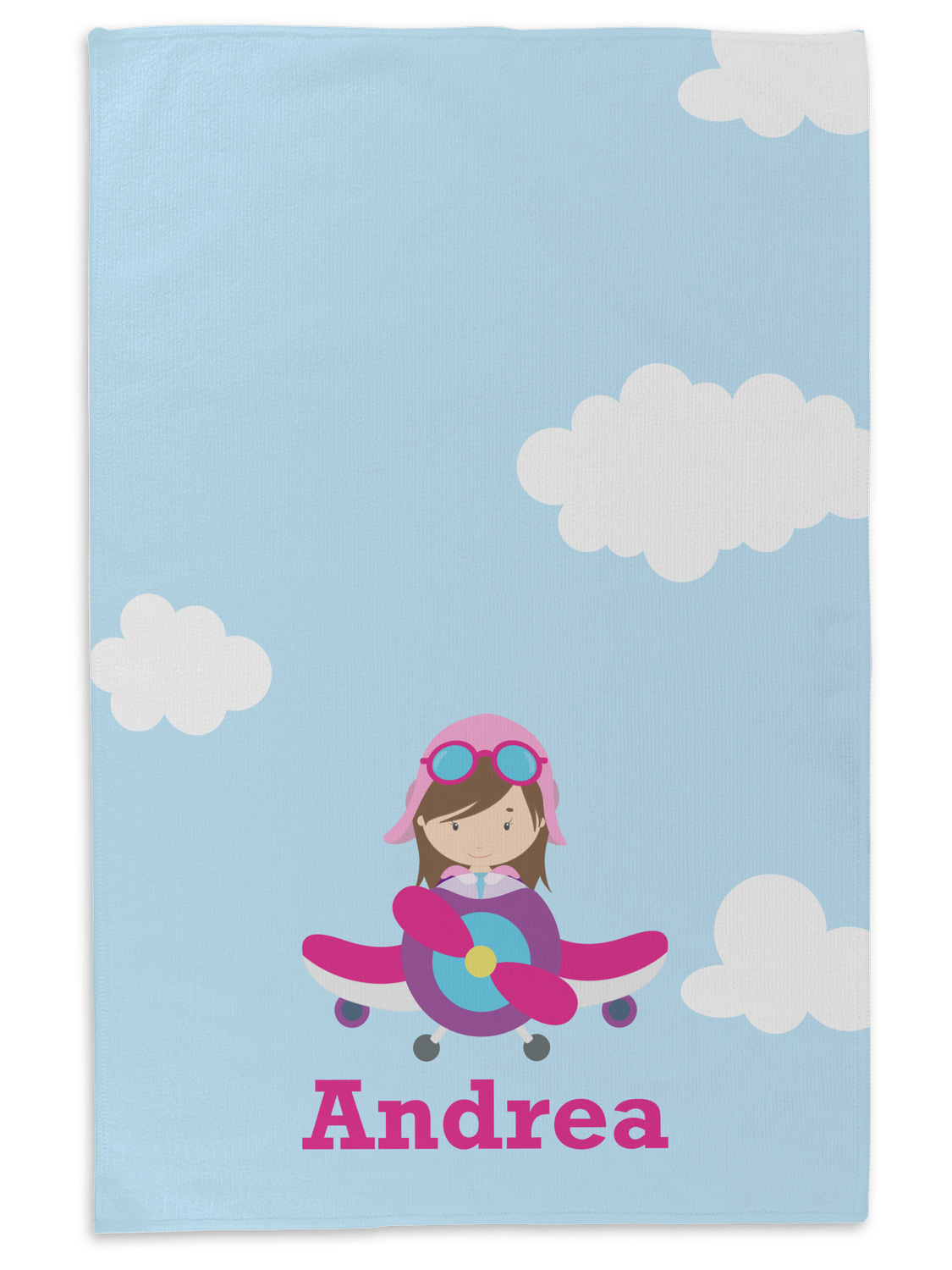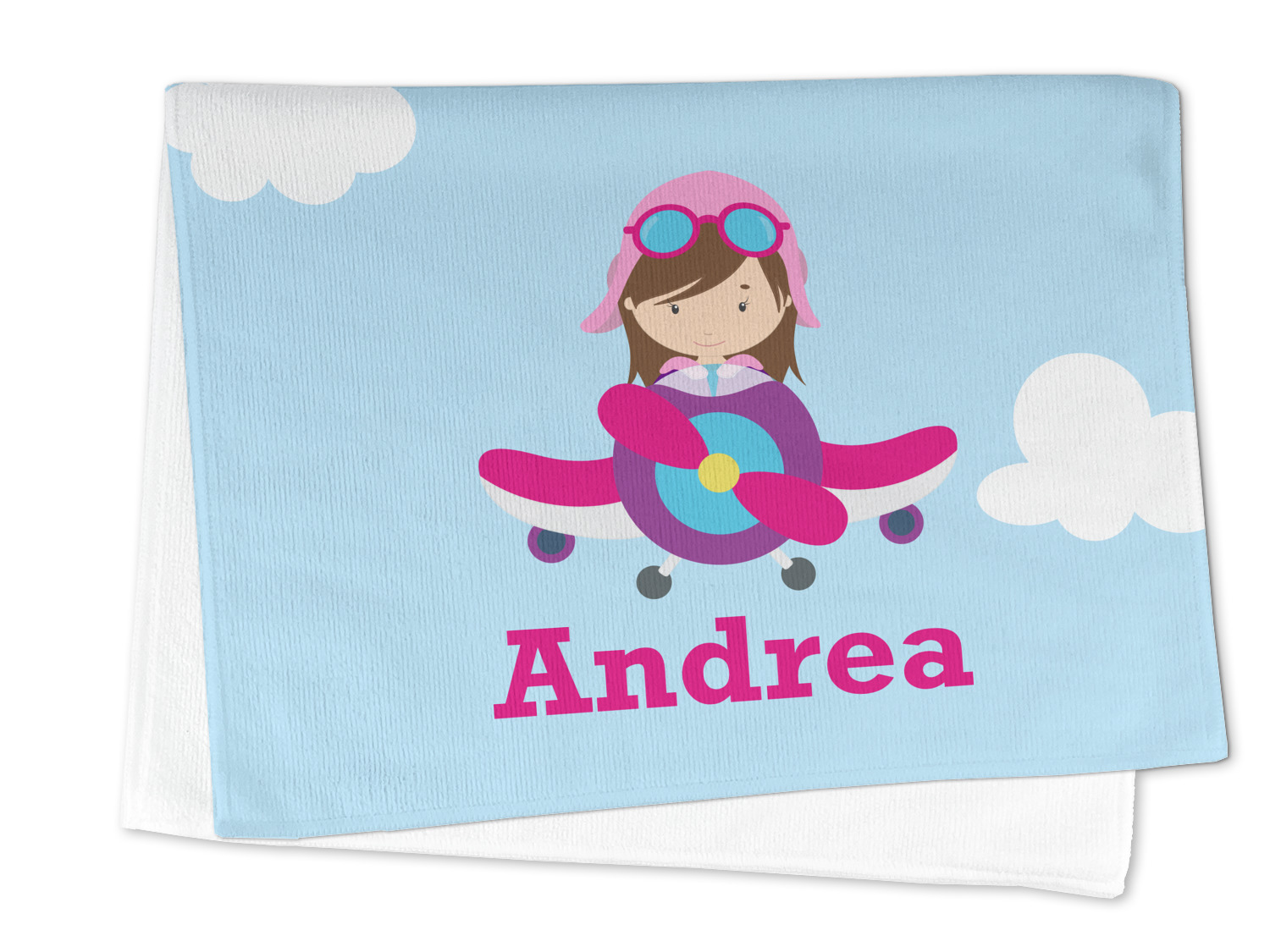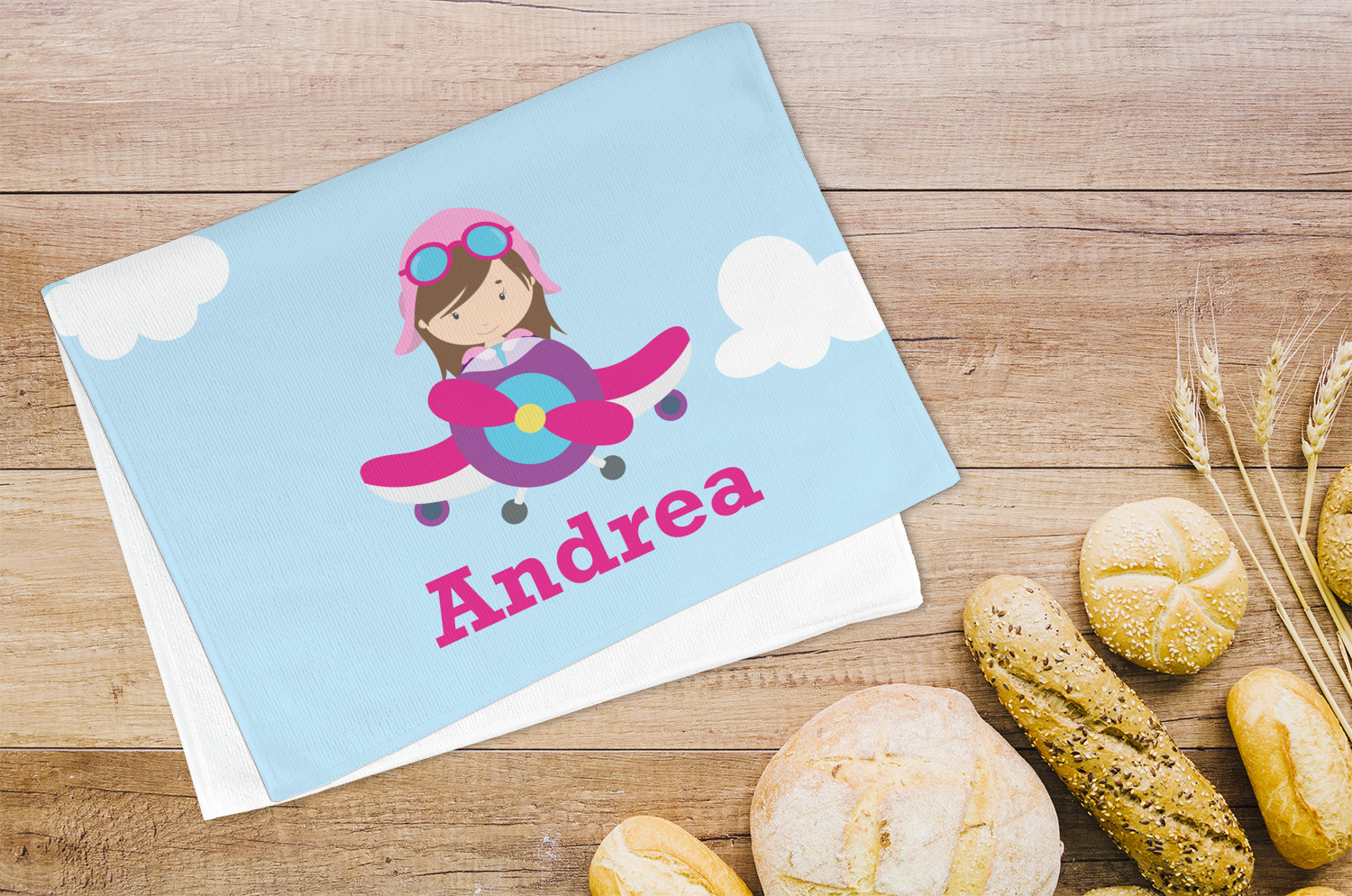 Do you have a little girl that loves planes? Soaring through on a backdrop of a beautiful blue cloudy sky is our fun flying aviator in the cockpit if her own personal plane brightly colored in shades of pink, purple, and blue. Don't forget to add that special touch by customizing the design with your little girl's name.