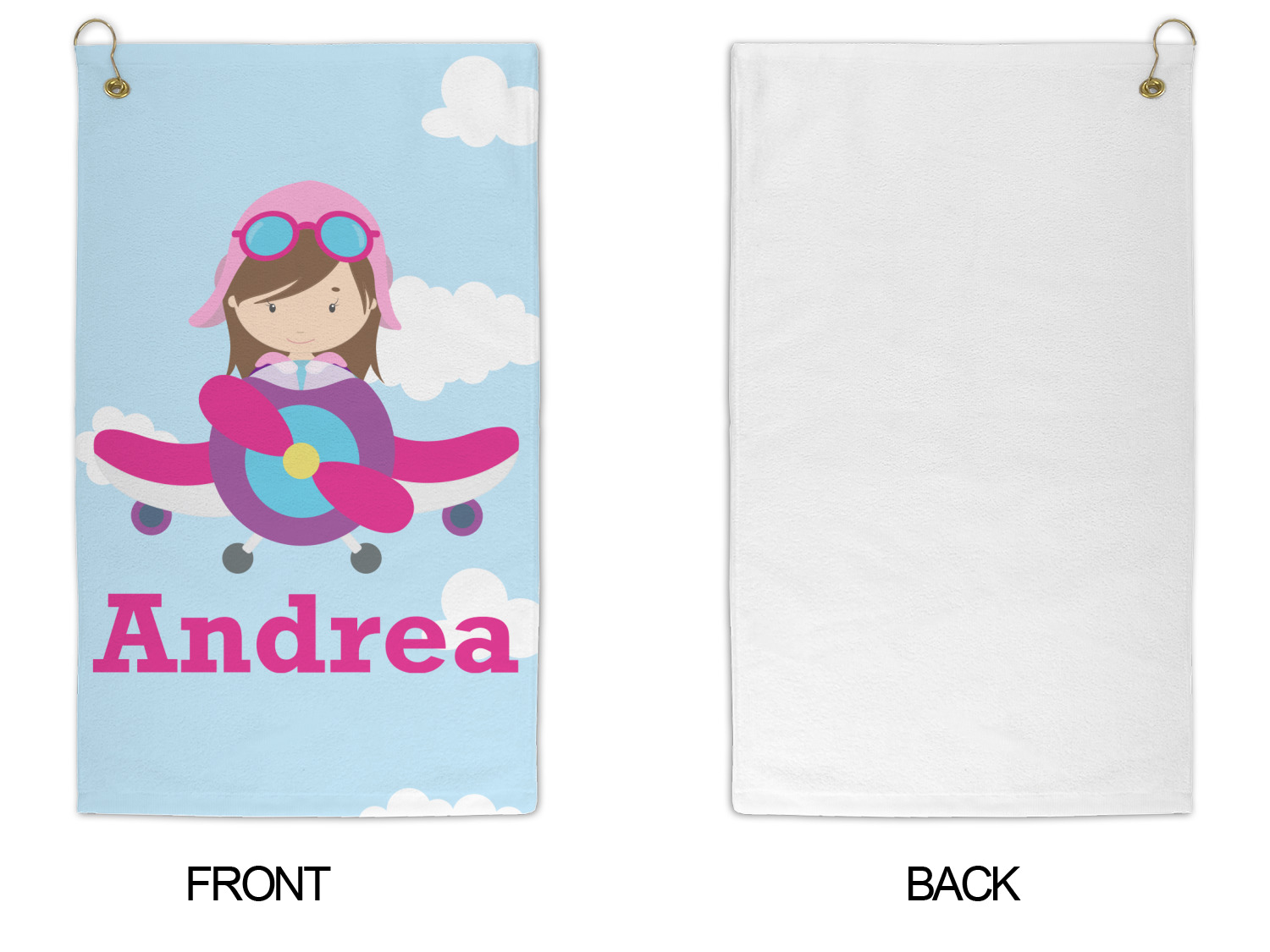 Do you have a little girl that loves planes? Soaring through on a backdrop of a beautiful blue cloudy sky is our fun flying aviator in the cockpit if her own personal plane brightly colored in shades of pink, purple, and blue. Don't forget to add that special touch by customizing the design with your little girl's name.