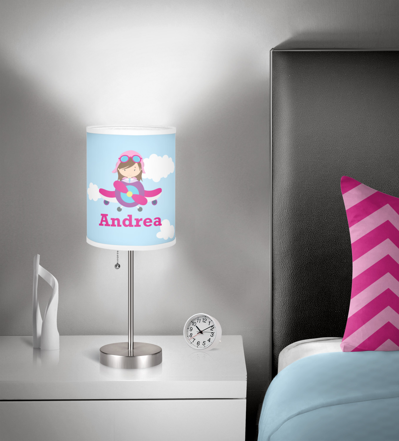Do you have a little girl that loves planes? Soaring through on a backdrop of a beautiful blue cloudy sky is our fun flying aviator in the cockpit if her own personal plane brightly colored in shades of pink, purple, and blue. Don't forget to add that special touch by customizing the design with your little girl's name.