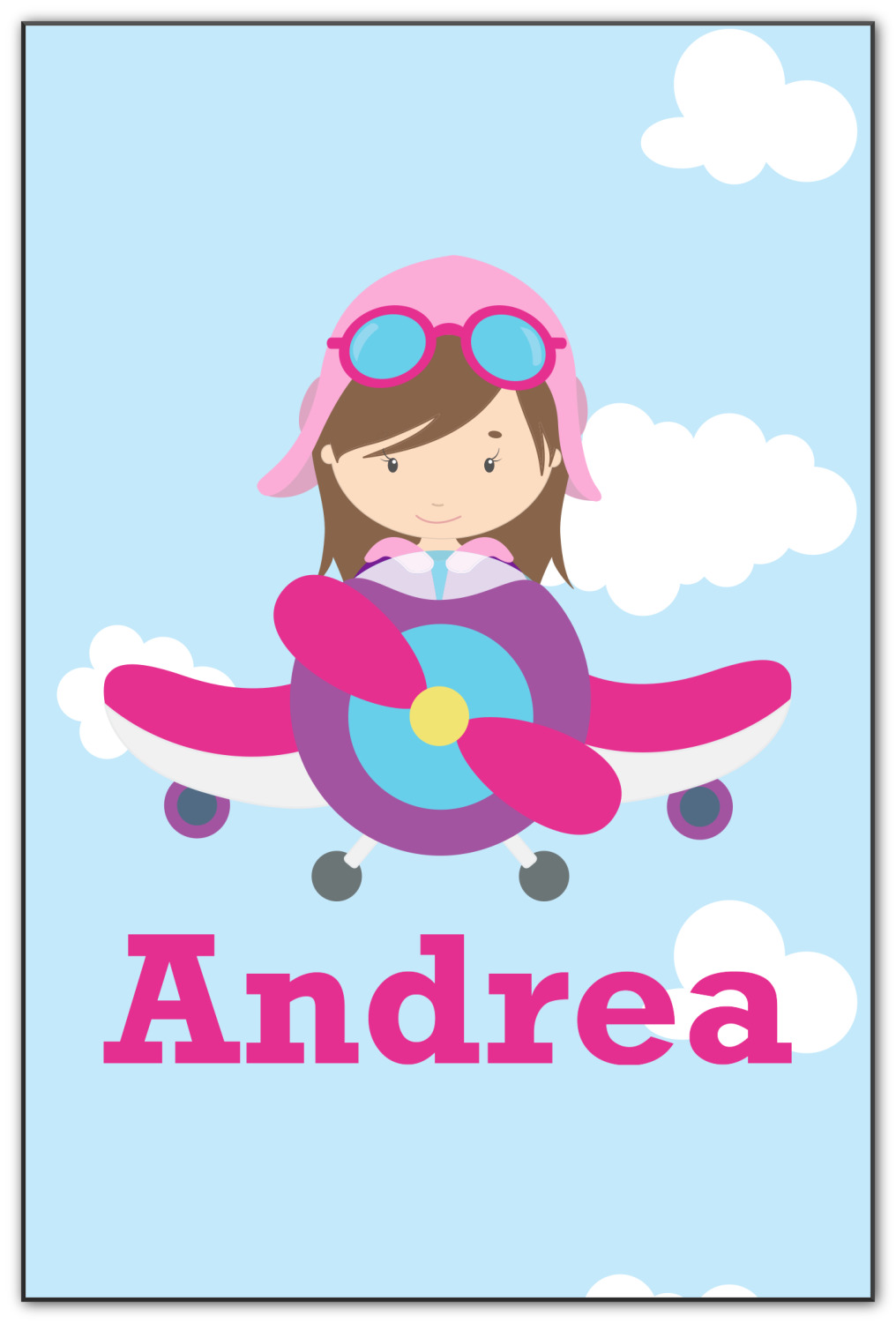 Do you have a little girl that loves planes? Soaring through on a backdrop of a beautiful blue cloudy sky is our fun flying aviator in the cockpit if her own personal plane brightly colored in shades of pink, purple, and blue. Don't forget to add that special touch by customizing the design with your little girl's name.