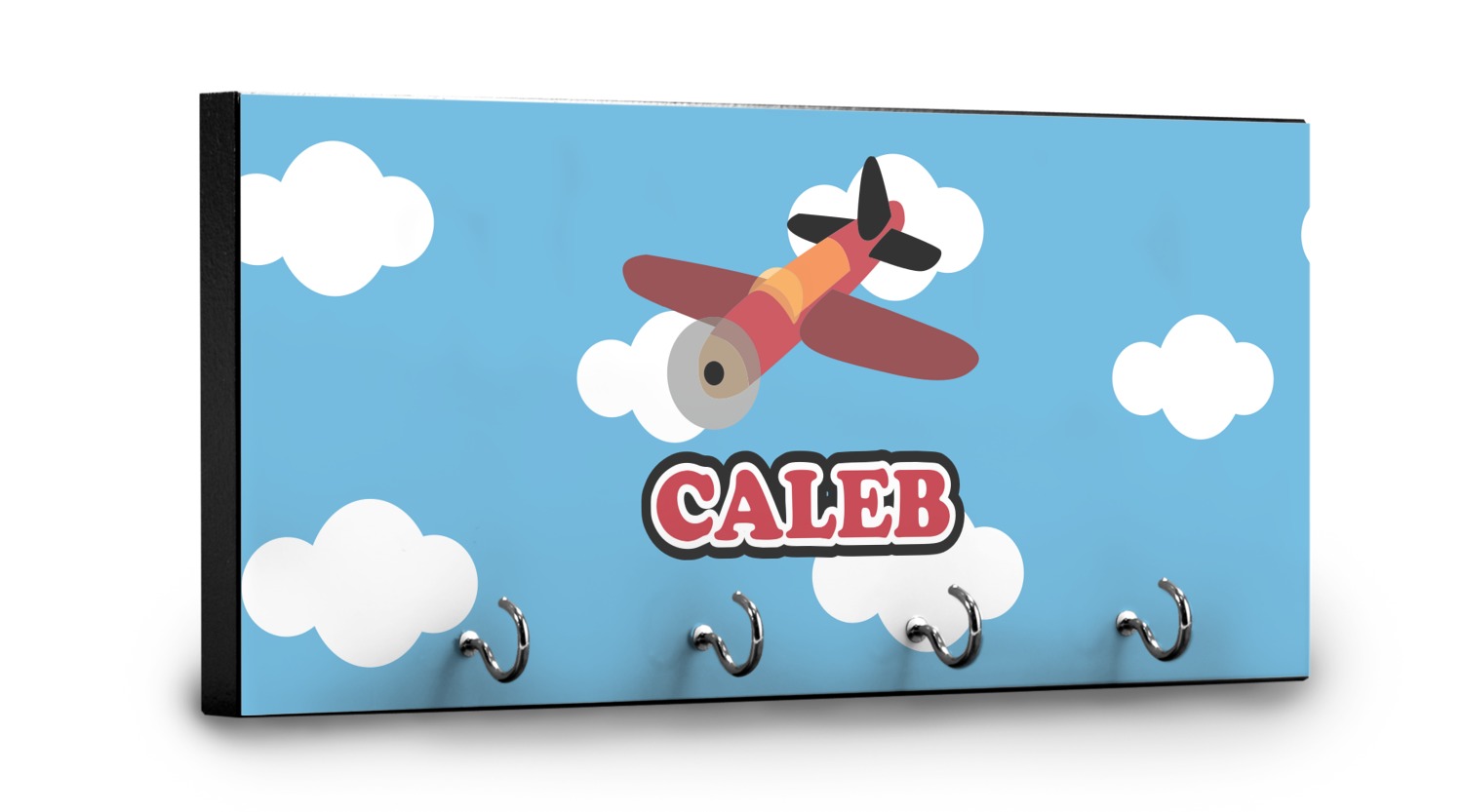 Calling all aviation enthusiast! Soaring through on a backdrop of a beautiful blue cloudy sky is our fun flying plane brightly colored in shades of reds and oranges. Don't forget to add that special touch by customizing the design with the name of your choice.
