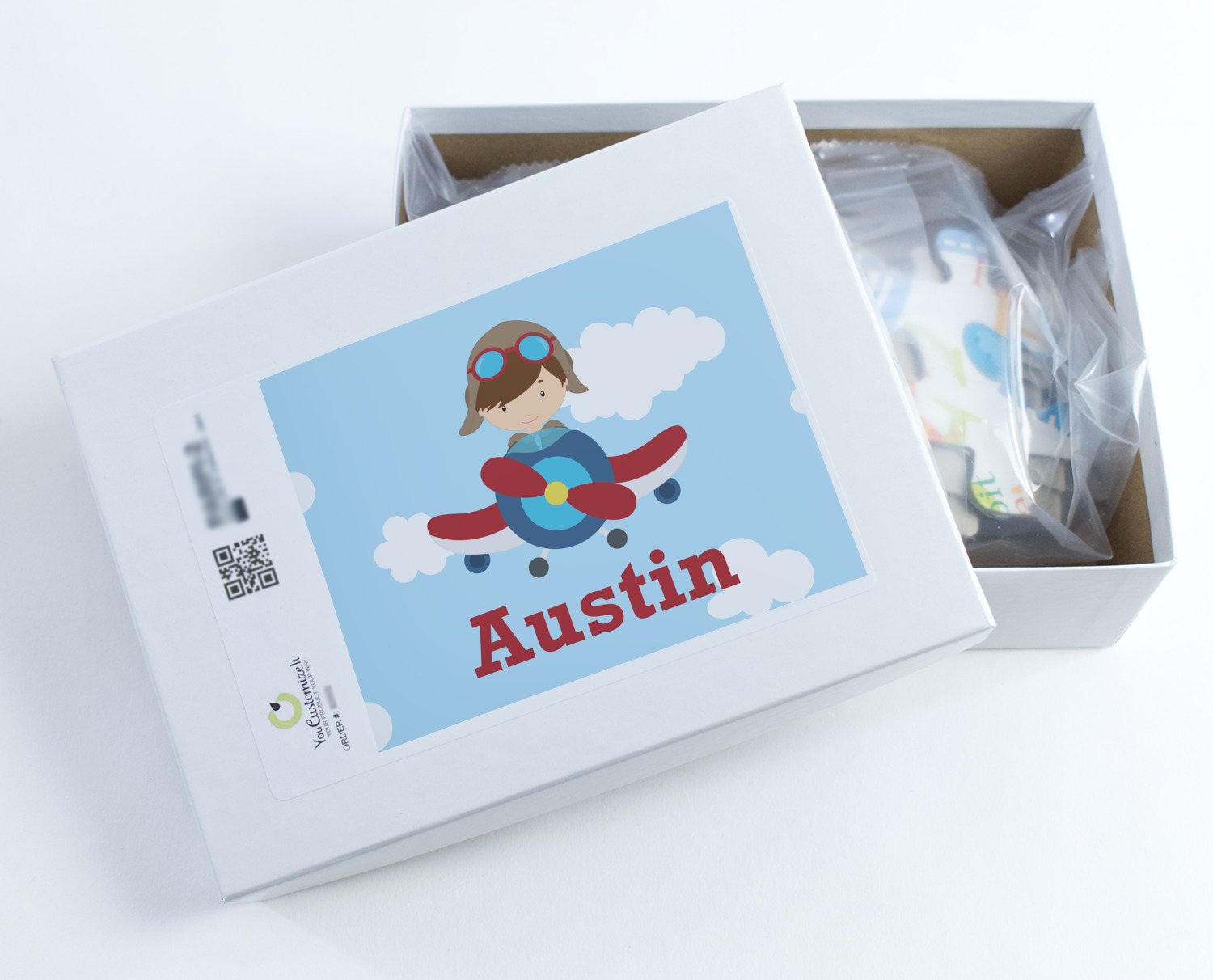 Do you have a little man that loves planes? Soaring through on a backdrop of a beautiful blue cloudy sky is our fun flying aviator piloting his own personal plane brightly colored in shades of red and blues. Don't forget to add that special touch by customizing the design with your little guy's name.