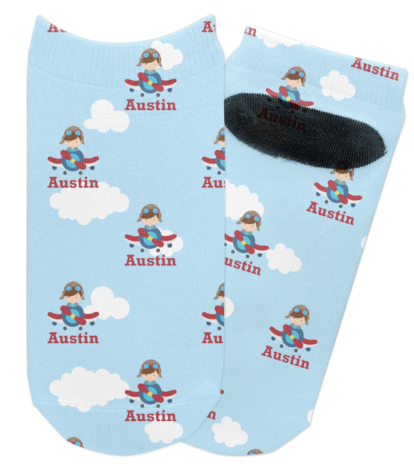 Do you have a little man that loves planes? Soaring through on a backdrop of a beautiful blue cloudy sky is our fun flying aviator piloting his own personal plane brightly colored in shades of red and blues. Don't forget to add that special touch by customizing the design with your little guy's name.