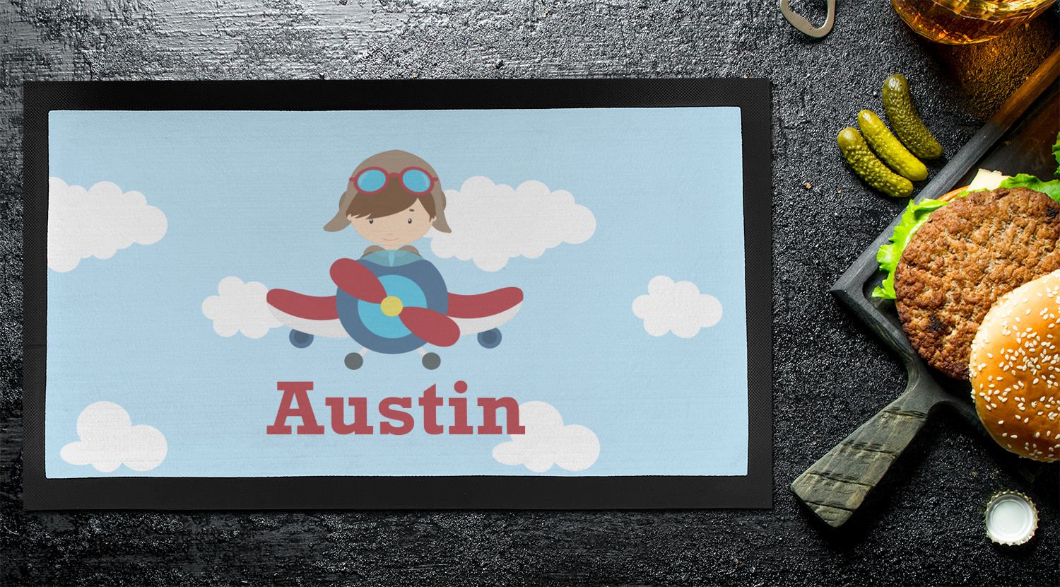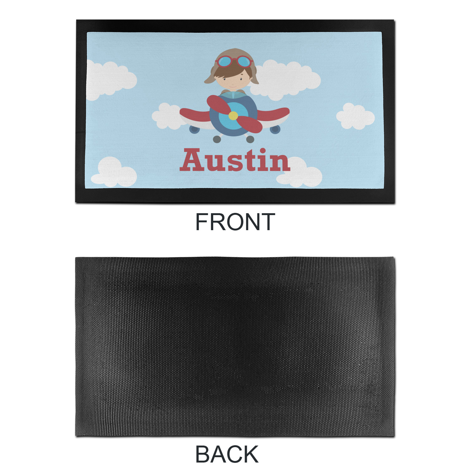 Do you have a little man that loves planes? Soaring through on a backdrop of a beautiful blue cloudy sky is our fun flying aviator piloting his own personal plane brightly colored in shades of red and blues. Don't forget to add that special touch by customizing the design with your little guy's name.
