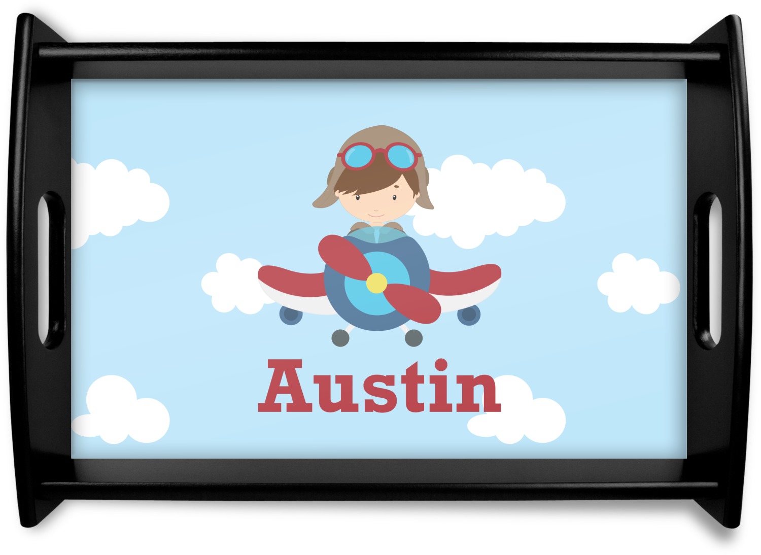 Do you have a little man that loves planes? Soaring through on a backdrop of a beautiful blue cloudy sky is our fun flying aviator piloting his own personal plane brightly colored in shades of red and blues. Don't forget to add that special touch by customizing the design with your little guy's name.