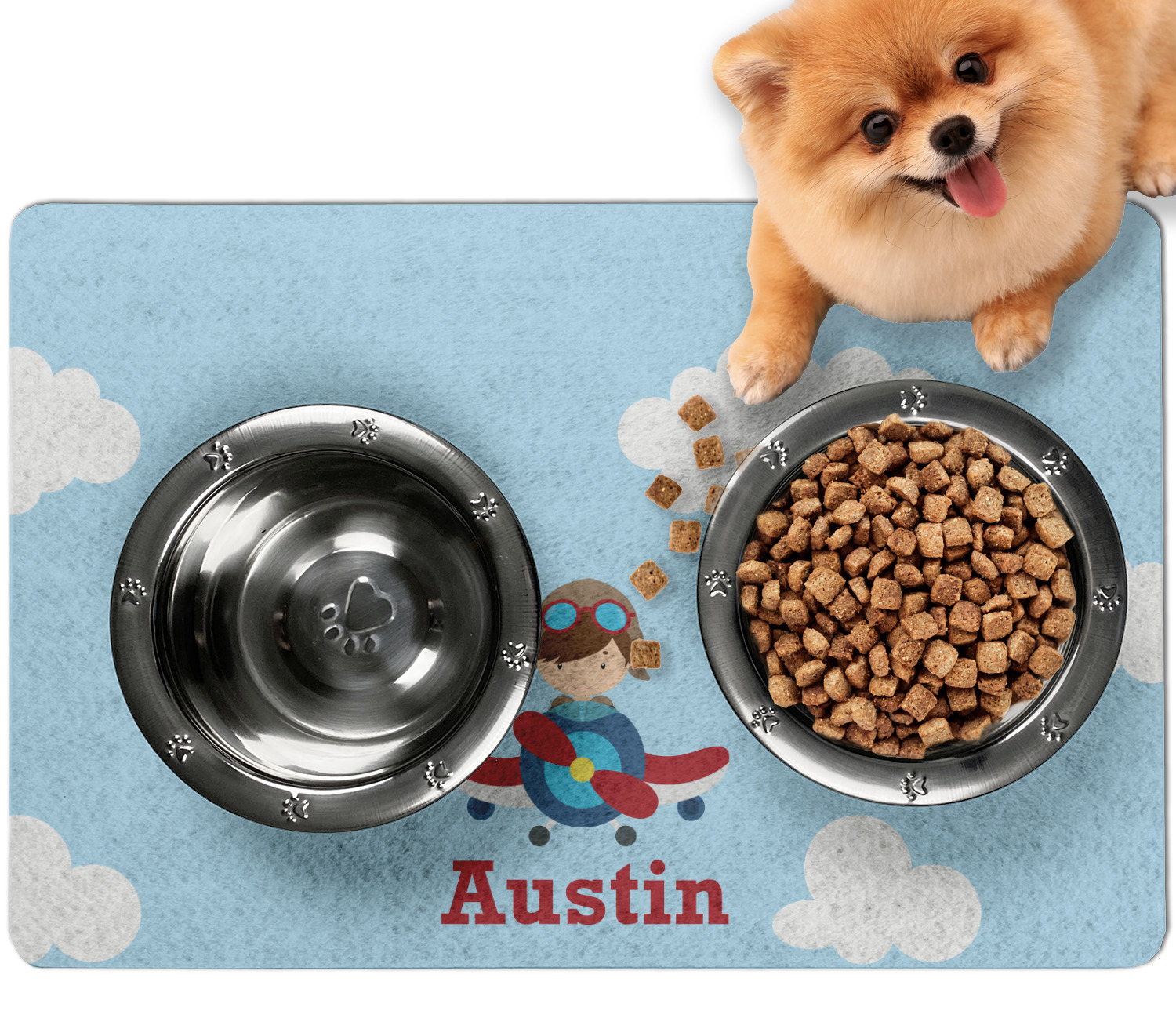 This dog bowl mat, fabricated from polyester, proudly displays your customized design on its top, while its bottom includes a non-slip rubber. This feature allows it to remain firmly in place, even when your dog spills his/her water. With 3 sizes available (18" x 12", 24" x 18", 30" x 24"), the pet food mat has ample space for both a food and water bowl for any sized dogs. Though specified for dogs' use, these mats are also a splendid option for cats.