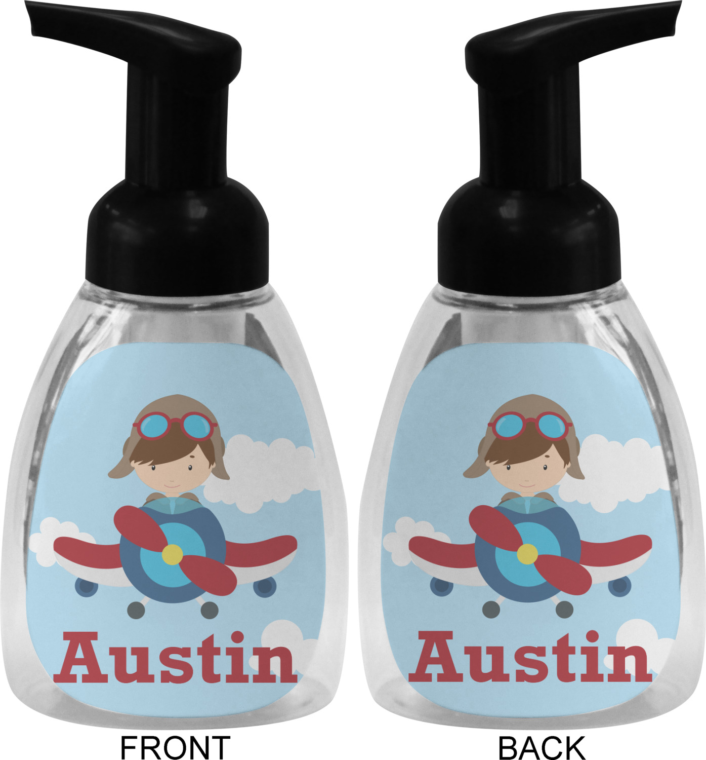 This soap dispenser is made of a robust plastic and has a clear base. The included soap pump is available in black or white color. This dispenser is 6.5 inches tall, 3 inches wide, and 2 inches deep. We display your customized designs on the front and back sides of these foaming hand soap dispensers.