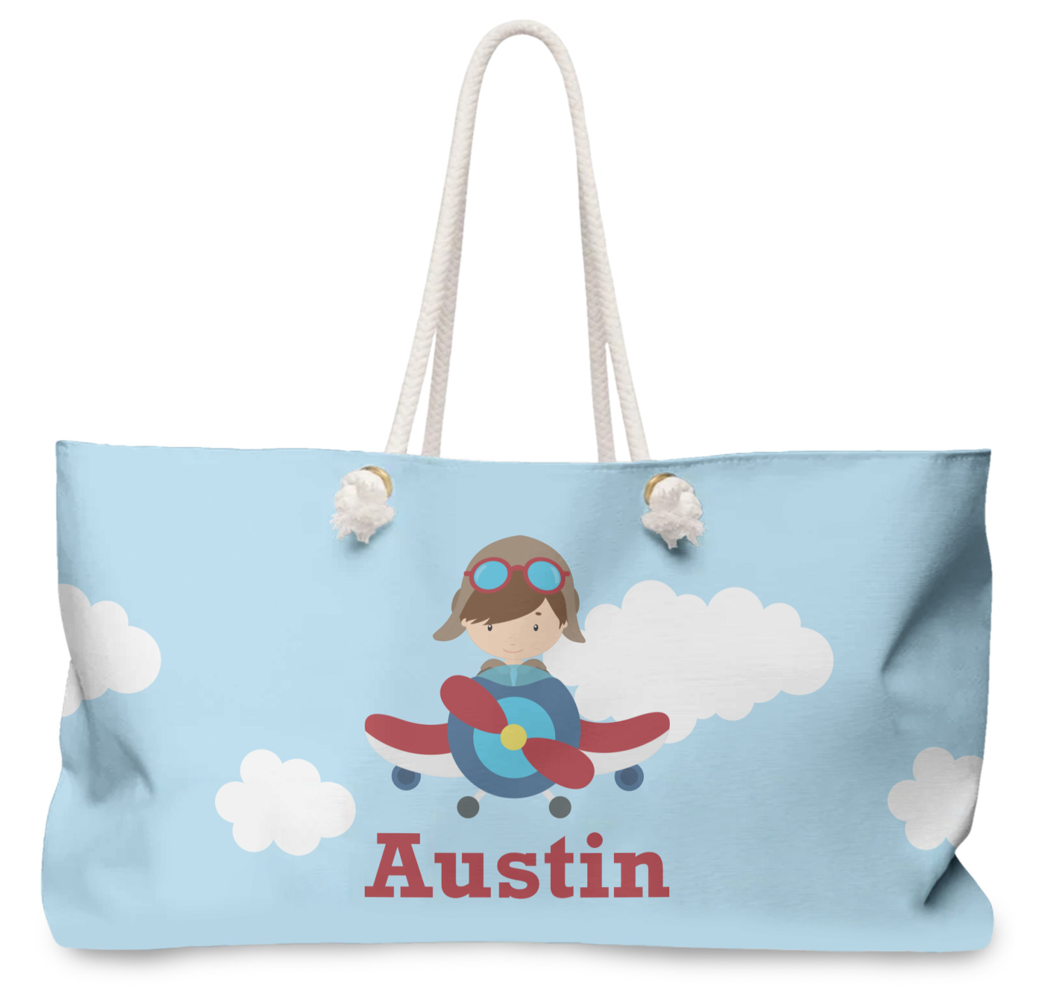 Do you have a little man that loves planes? Soaring through on a backdrop of a beautiful blue cloudy sky is our fun flying aviator piloting his own personal plane brightly colored in shades of red and blues. Don't forget to add that special touch by customizing the design with your little guy's name.