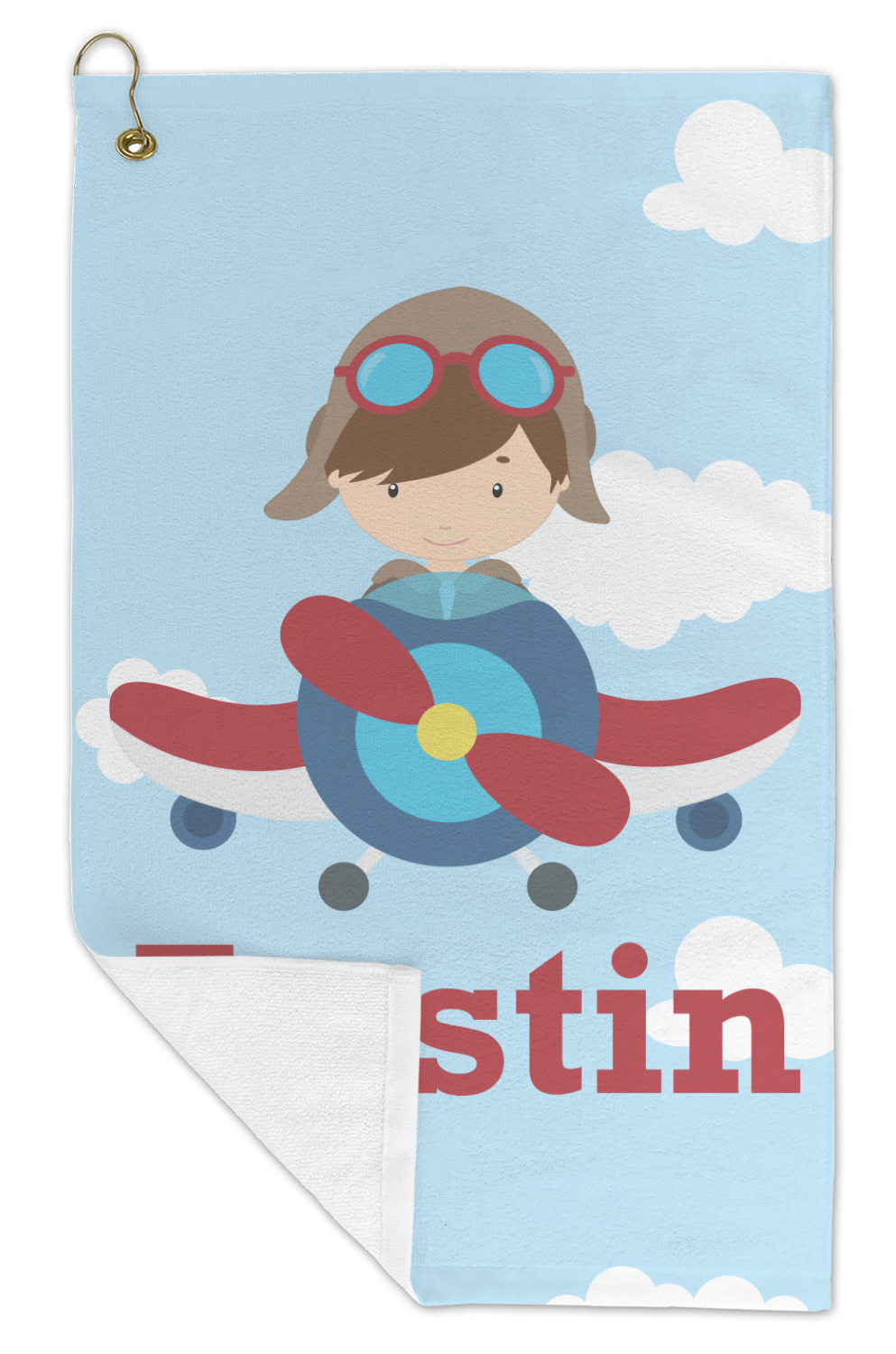 Do you have a little man that loves planes? Soaring through on a backdrop of a beautiful blue cloudy sky is our fun flying aviator piloting his own personal plane brightly colored in shades of red and blues. Don't forget to add that special touch by customizing the design with your little guy's name.