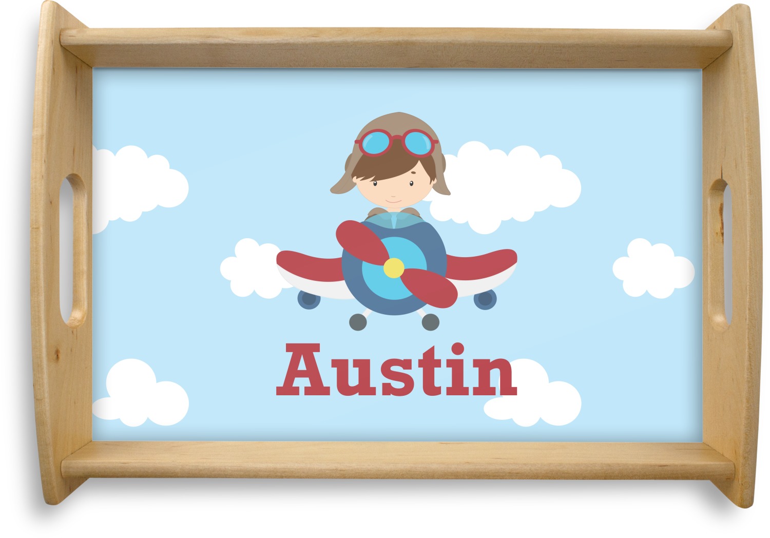 Do you have a little man that loves planes? Soaring through on a backdrop of a beautiful blue cloudy sky is our fun flying aviator piloting his own personal plane brightly colored in shades of red and blues. Don't forget to add that special touch by customizing the design with your little guy's name.