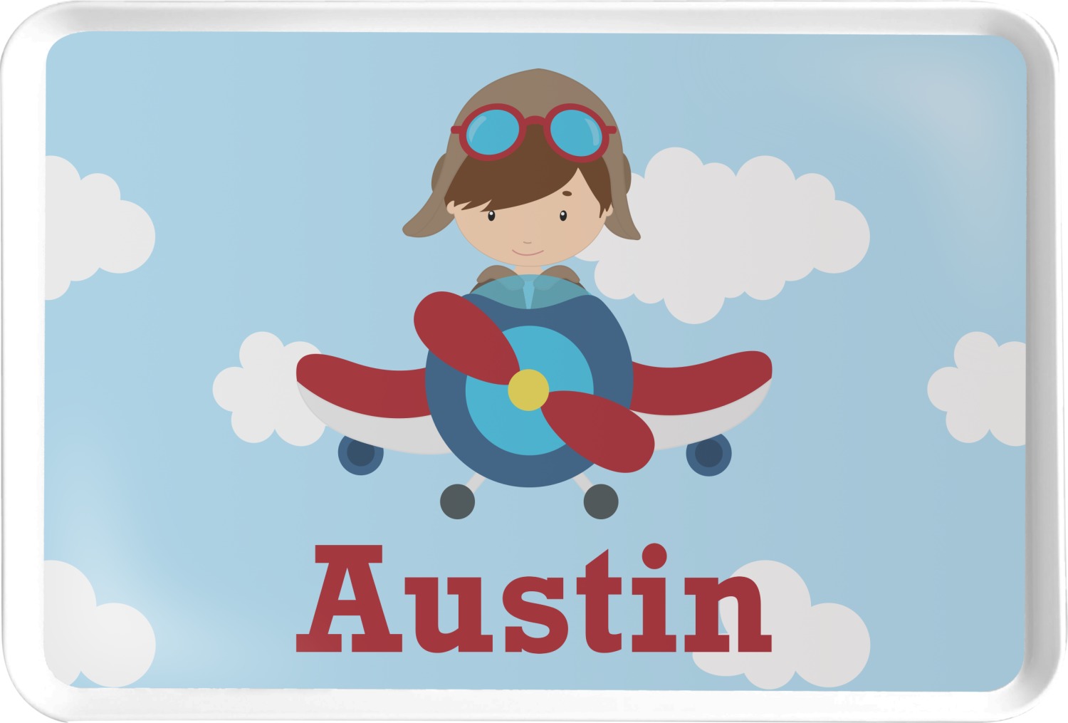 Do you have a little man that loves planes? Soaring through on a backdrop of a beautiful blue cloudy sky is our fun flying aviator piloting his own personal plane brightly colored in shades of red and blues. Don't forget to add that special touch by customizing the design with your little guy's name.