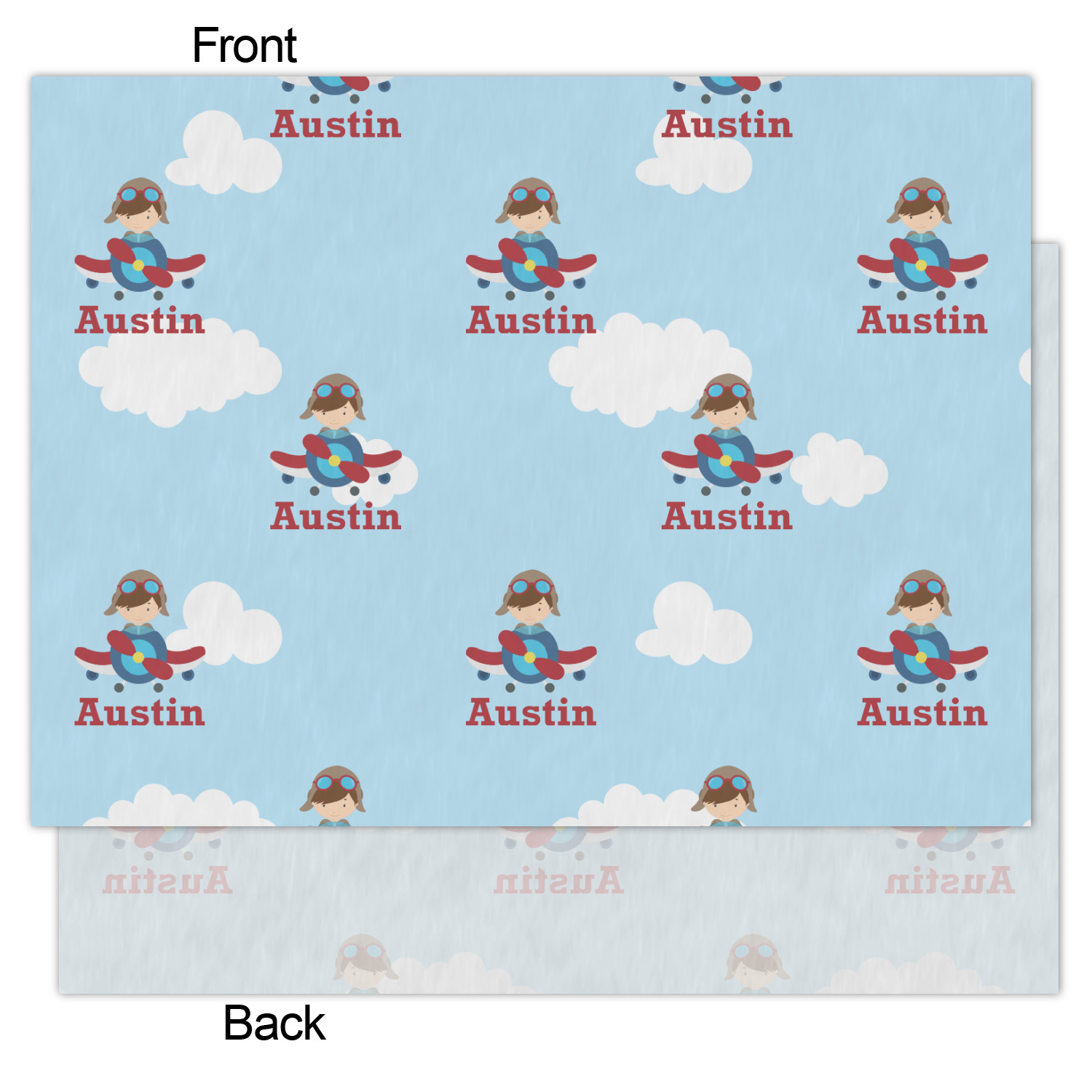 Do you have a little man that loves planes? Soaring through on a backdrop of a beautiful blue cloudy sky is our fun flying aviator piloting his own personal plane brightly colored in shades of red and blues. Don't forget to add that special touch by customizing the design with your little guy's name.