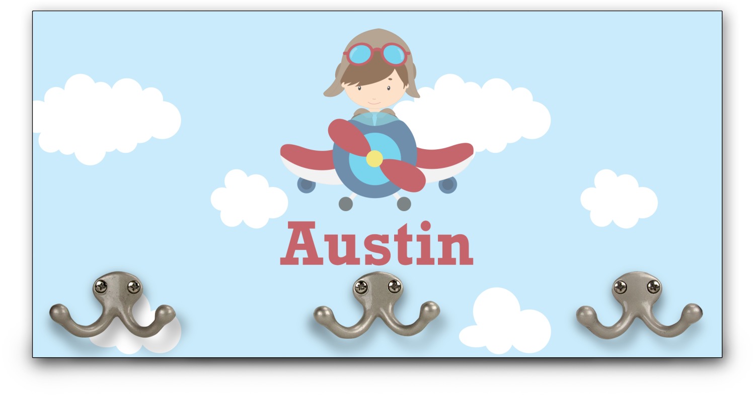 Do you have a little man that loves planes? Soaring through on a backdrop of a beautiful blue cloudy sky is our fun flying aviator piloting his own personal plane brightly colored in shades of red and blues. Don't forget to add that special touch by customizing the design with your little guy's name.