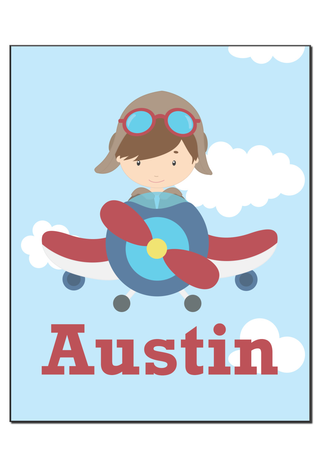 Do you have a little man that loves planes? Soaring through on a backdrop of a beautiful blue cloudy sky is our fun flying aviator piloting his own personal plane brightly colored in shades of red and blues. Don't forget to add that special touch by customizing the design with your little guy's name.