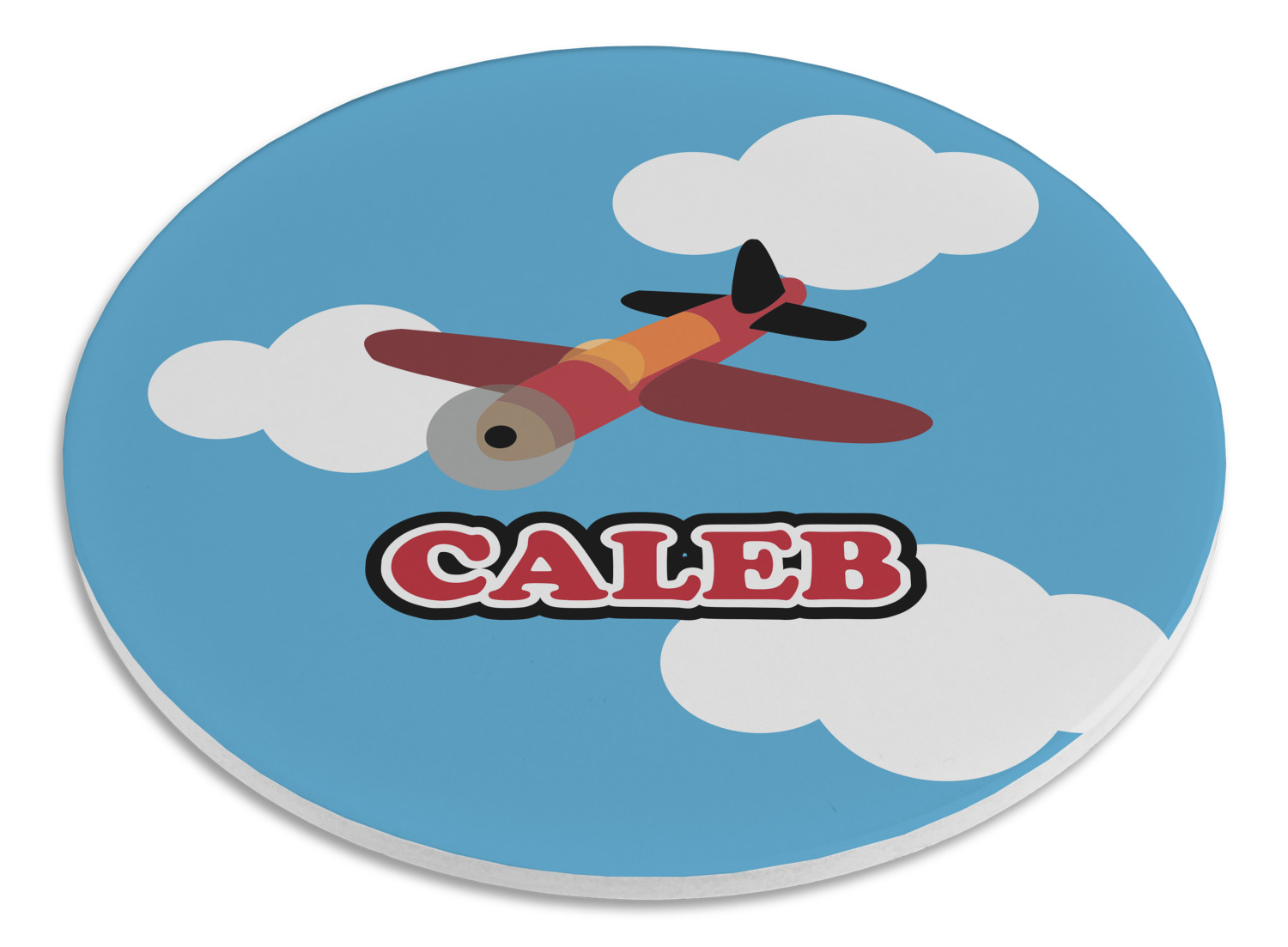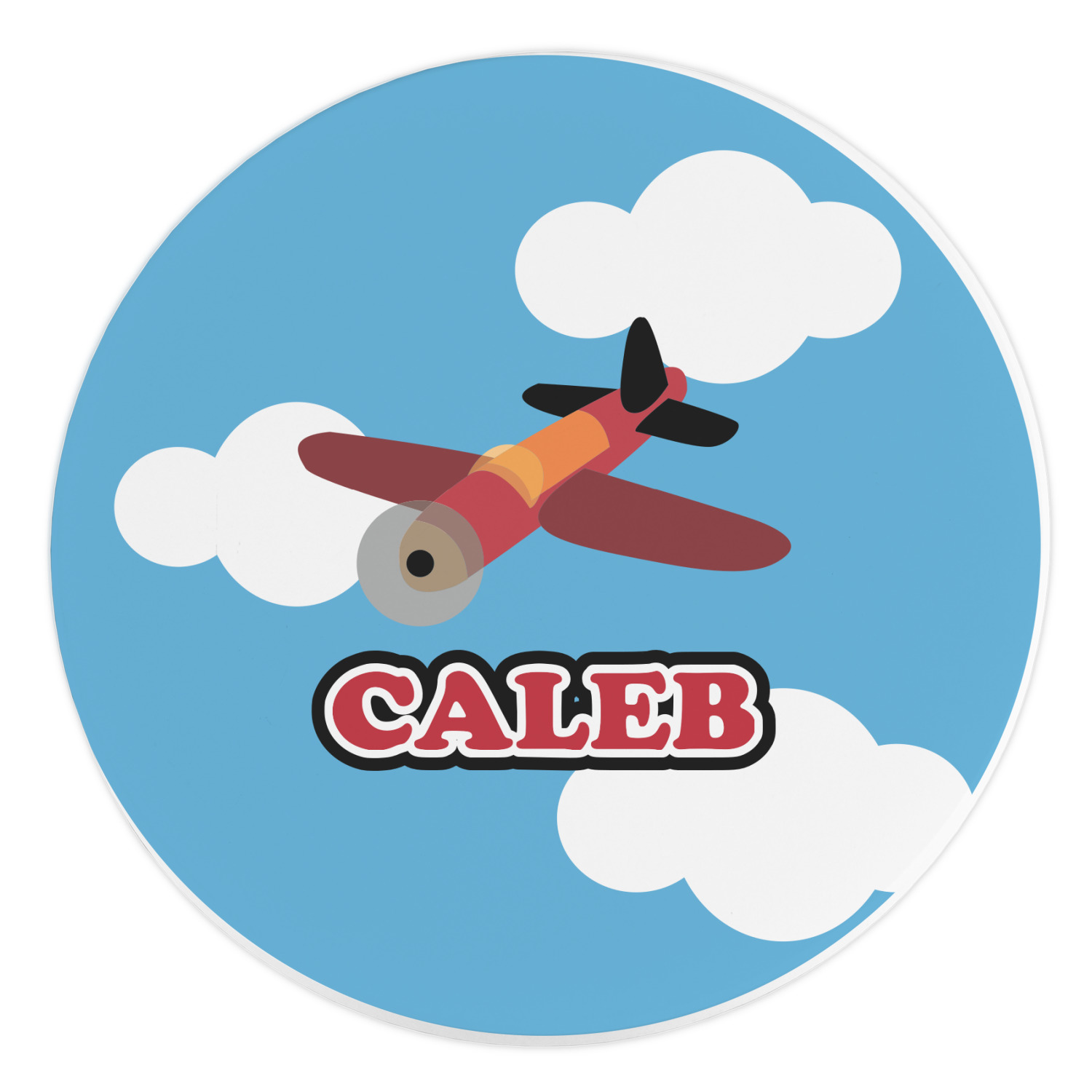Calling all aviation enthusiast! Soaring through on a backdrop of a beautiful blue cloudy sky is our fun flying plane brightly colored in shades of reds and oranges. Don't forget to add that special touch by customizing the design with the name of your choice.