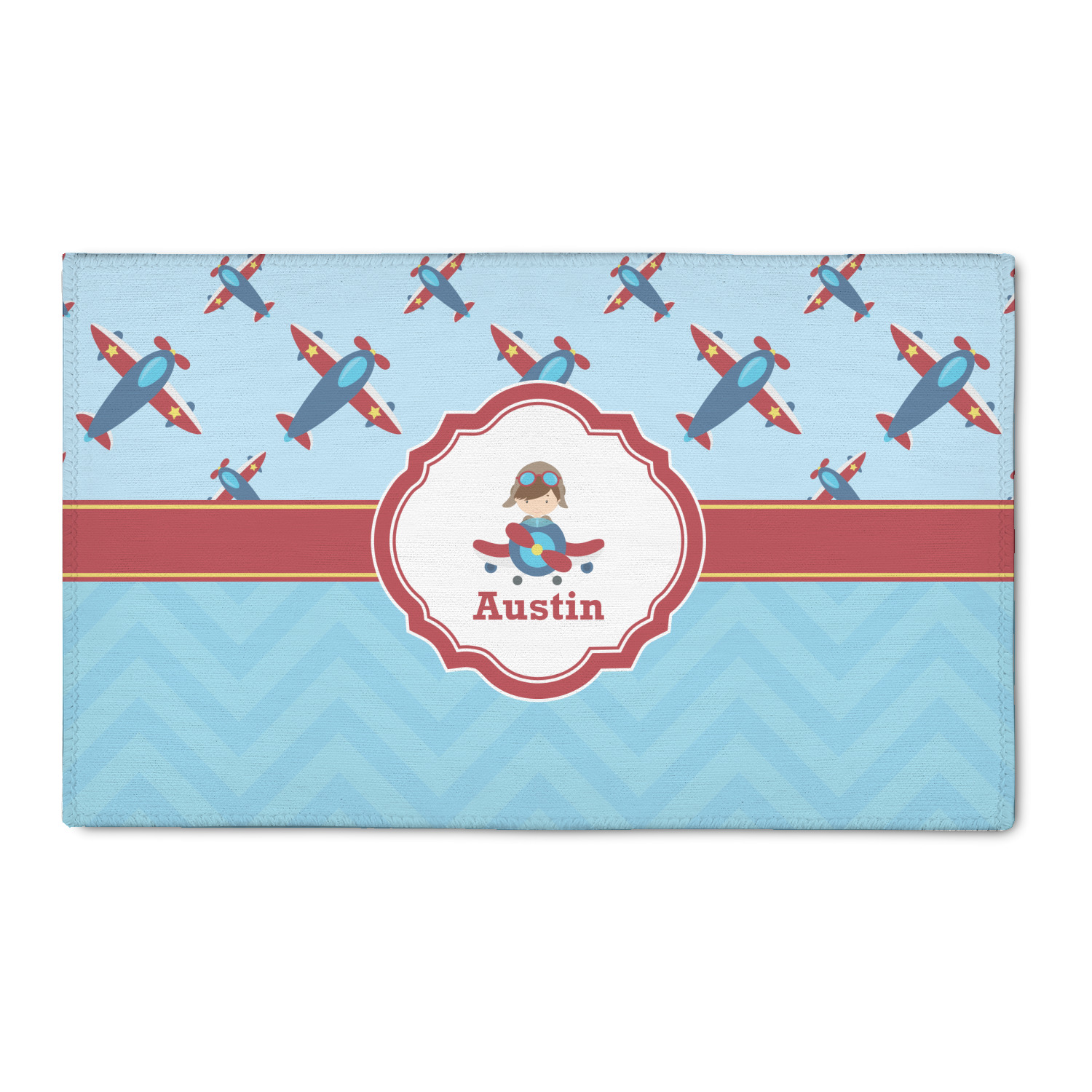 This Airplane themed design features a little pilot in his own plane with his name just below it within a red and yellow frame. The design also features planes in the sky above and blue chevron stripes below with a red stripe to tie it all together.