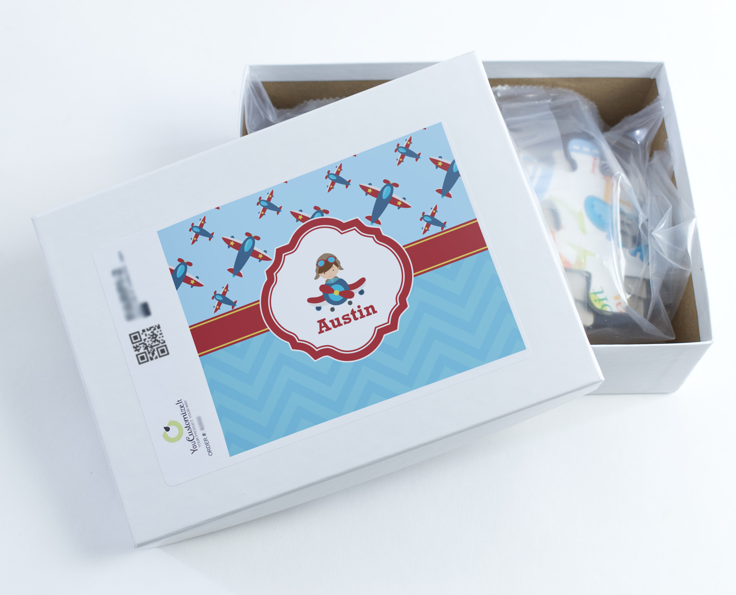 This Airplane themed design features a little pilot in his own plane with his name just below it within a red and yellow frame. The design also features planes in the sky above and blue chevron stripes below with a red stripe to tie it all together.