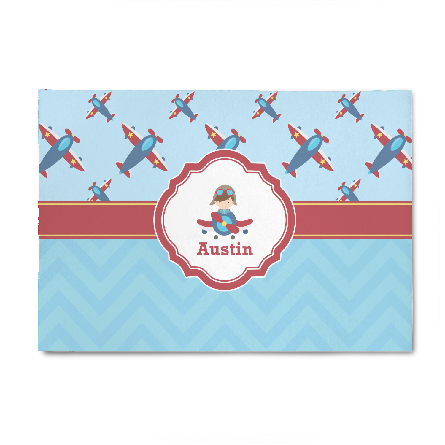 This Airplane themed design features a little pilot in his own plane with his name just below it within a red and yellow frame. The design also features planes in the sky above and blue chevron stripes below with a red stripe to tie it all together.