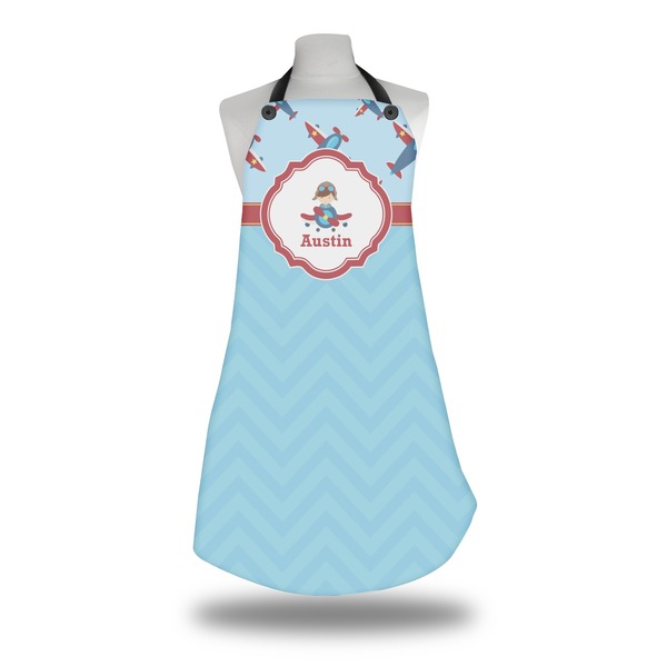 This Airplane themed design features a little pilot in his own plane with his name just below it within a red and yellow frame. The design also features planes in the sky above and blue chevron stripes below with a red stripe to tie it all together.