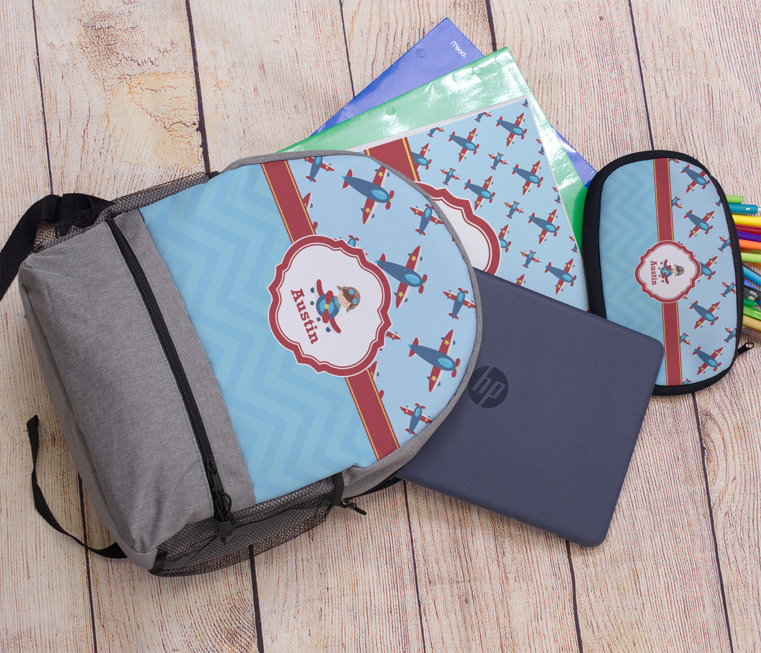 This Airplane themed design features a little pilot in his own plane with his name just below it within a red and yellow frame. The design also features planes in the sky above and blue chevron stripes below with a red stripe to tie it all together.