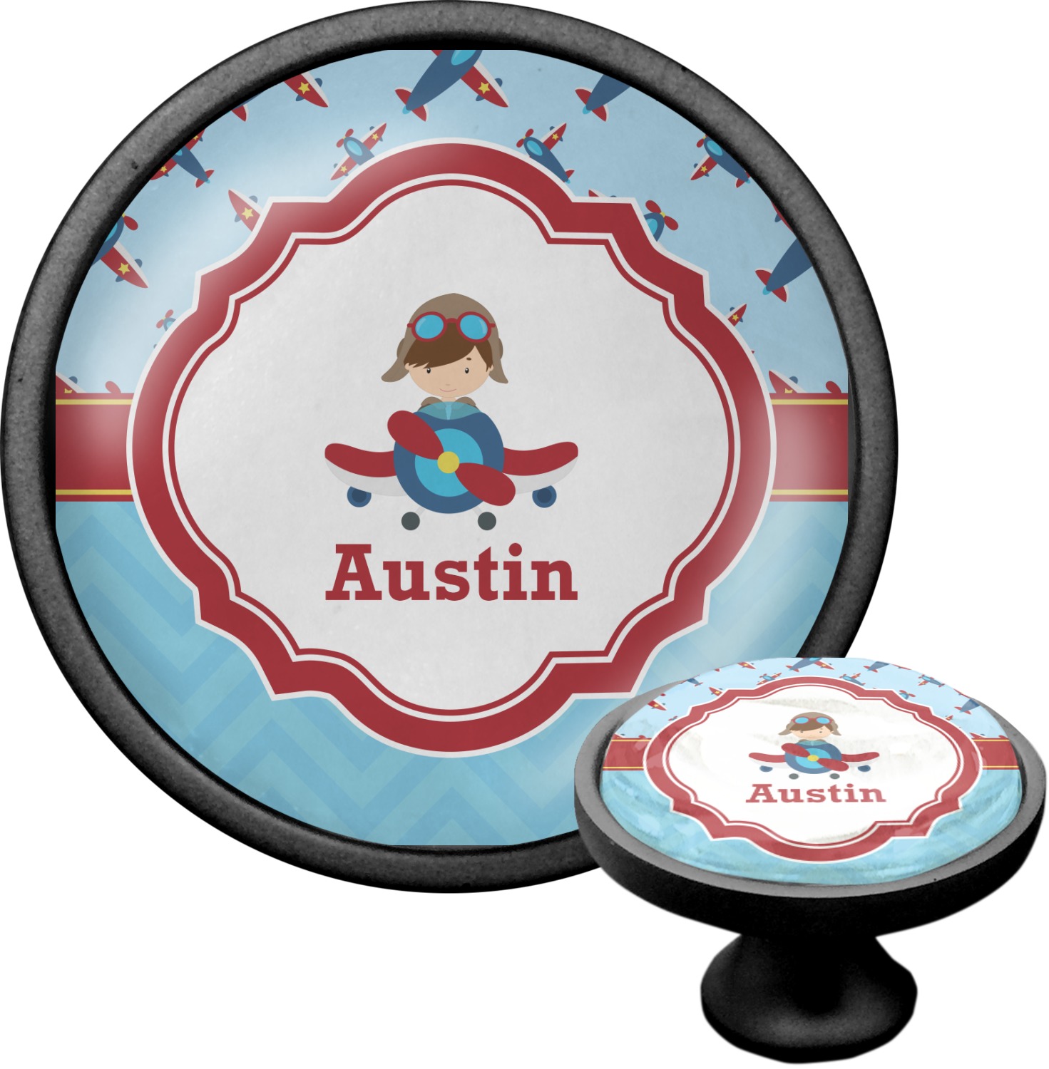 This Airplane themed design features a little pilot in his own plane with his name just below it within a red and yellow frame. The design also features planes in the sky above and blue chevron stripes below with a red stripe to tie it all together.