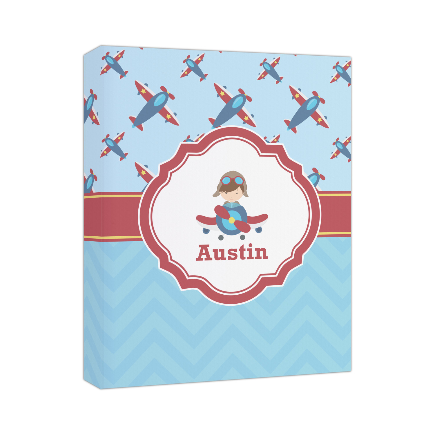 This Airplane themed design features a little pilot in his own plane with his name just below it within a red and yellow frame. The design also features planes in the sky above and blue chevron stripes below with a red stripe to tie it all together.