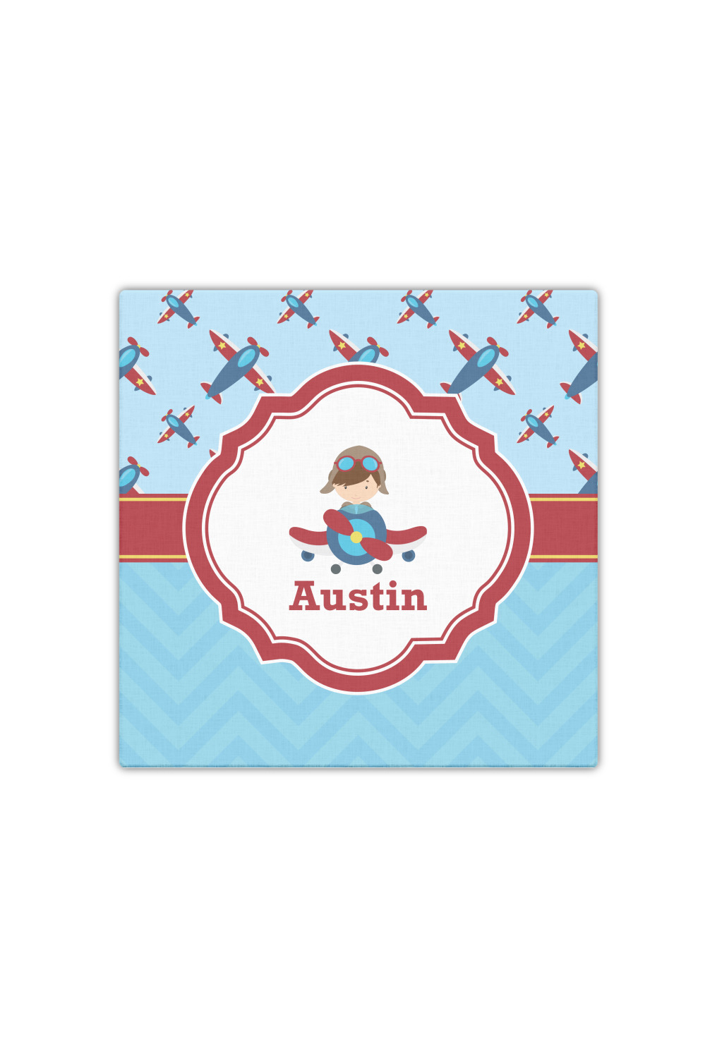 This Airplane themed design features a little pilot in his own plane with his name just below it within a red and yellow frame. The design also features planes in the sky above and blue chevron stripes below with a red stripe to tie it all together.