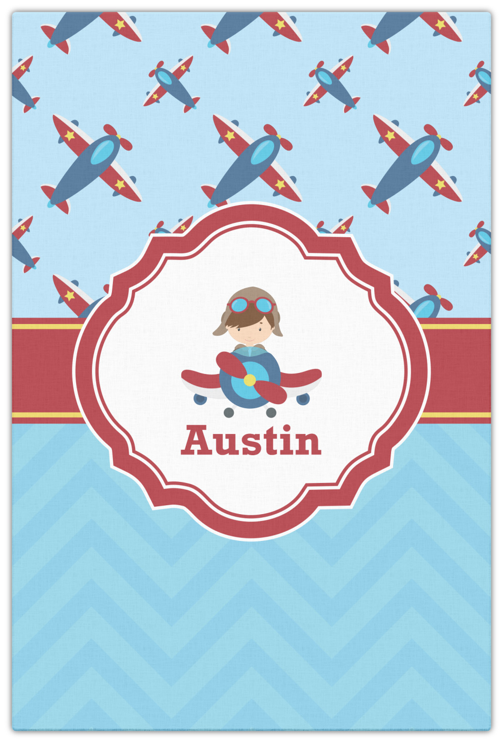 This Airplane themed design features a little pilot in his own plane with his name just below it within a red and yellow frame. The design also features planes in the sky above and blue chevron stripes below with a red stripe to tie it all together.
