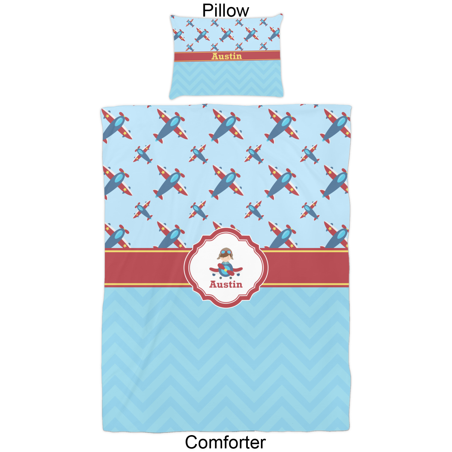 This Airplane themed design features a little pilot in his own plane with his name just below it within a red and yellow frame. The design also features planes in the sky above and blue chevron stripes below with a red stripe to tie it all together.
