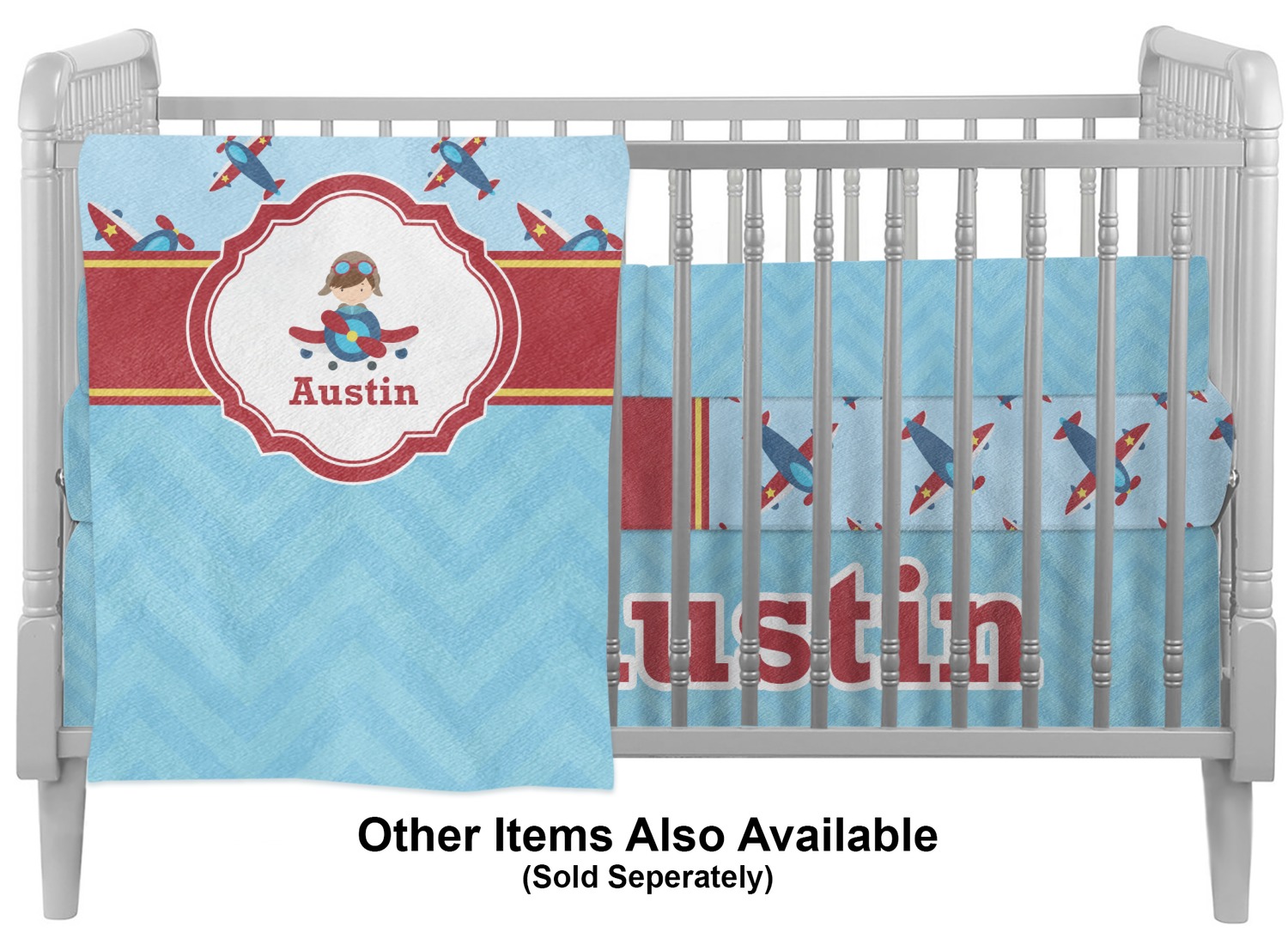 This Airplane themed design features a little pilot in his own plane with his name just below it within a red and yellow frame. The design also features planes in the sky above and blue chevron stripes below with a red stripe to tie it all together.