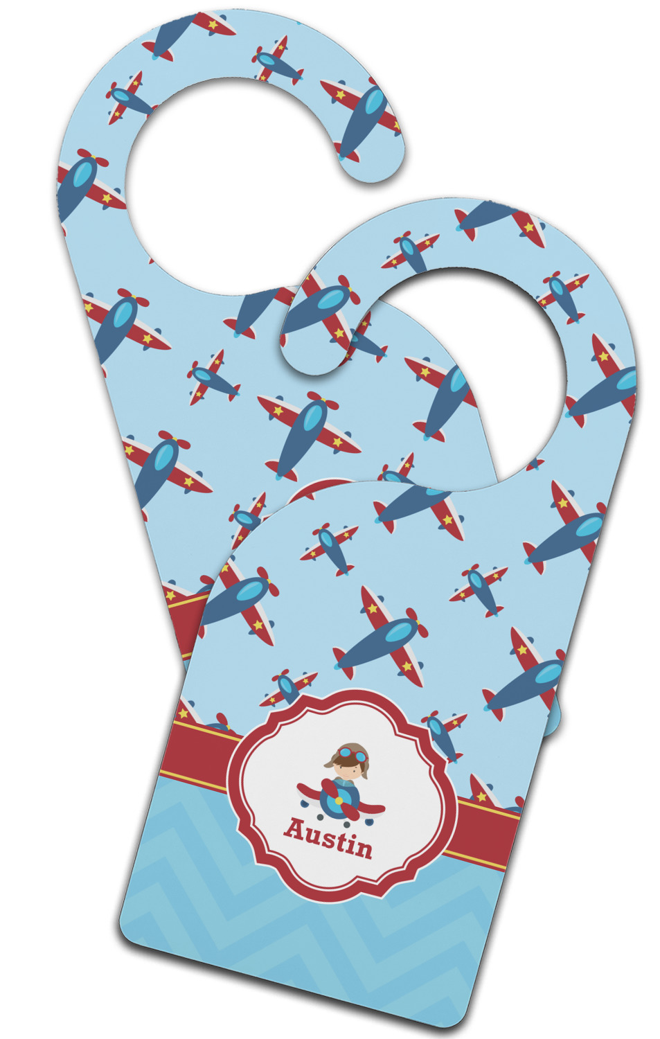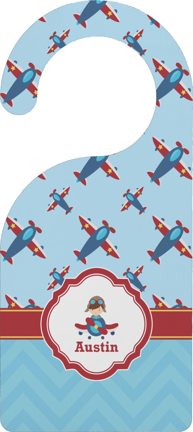 This Airplane themed design features a little pilot in his own plane with his name just below it within a red and yellow frame. The design also features planes in the sky above and blue chevron stripes below with a red stripe to tie it all together.